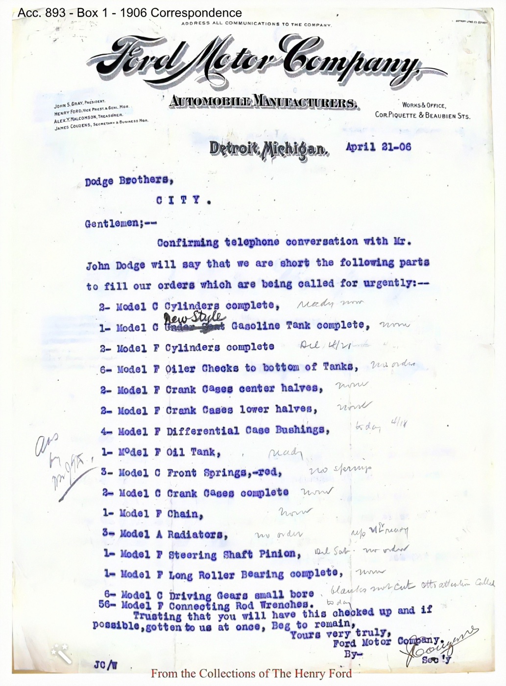 James Couzens letter to John Dodge requesting Model A, C & F parts FMC was in need of, dated April 21, 1906. Ford was just sending out the first production Model K, (April 15, 1906) and still several months (July) from the first Model N production.
