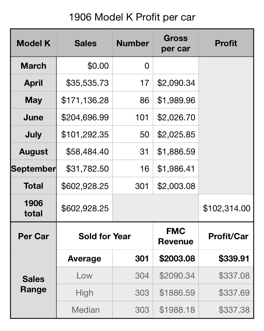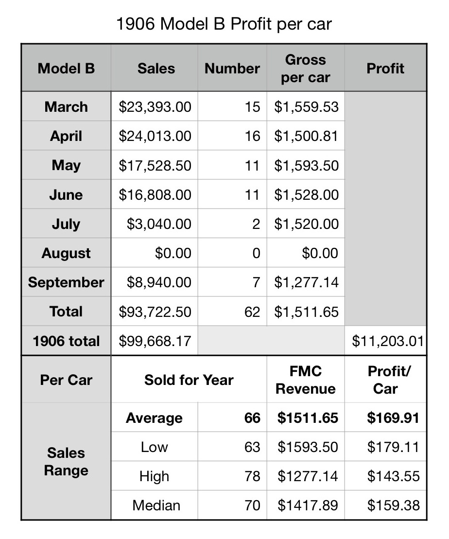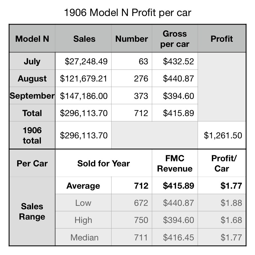 While the Model N was the company’s future, production delays and underpricing (the “N” price was raised 20% to $600 in February 1907) caused the model to be a non factor financially for 1906. The attached spreadsheets were taken from FMC’s 1906 independent audit, indicating the number of each model sold in FY 1906, as well as the profit each car generated.