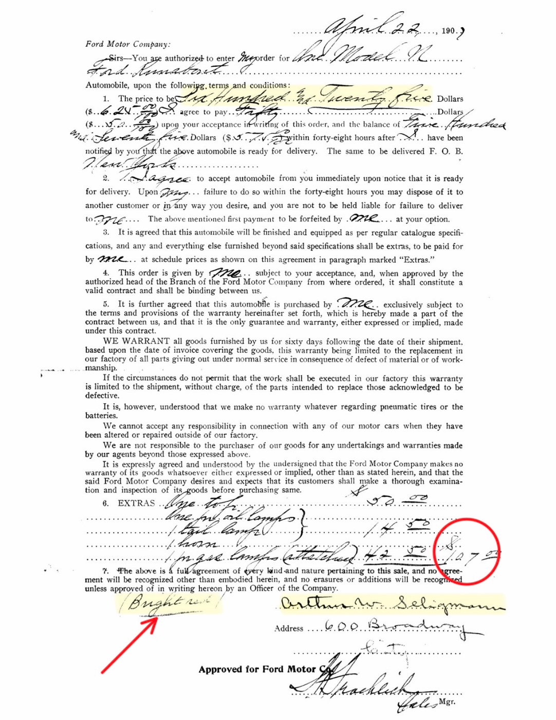 I marked up items that caught my attention. First, the base price (top yellow highlight), $625. This contract was signed in April 1907, when the retail Ford price of N was $600. My presumption is the additional cost is shipping (Detroit to NY).
