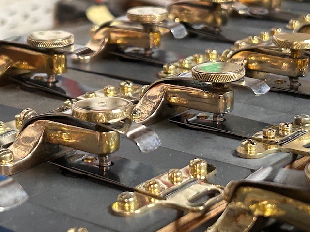 Tuning a batch of Kingston High Bridge. This model coil was used in Model T from 1909-1910. There are a few original coils in this batch and the rest are brand new coils. The brass bridge was cast and machined and new wood boxes made.