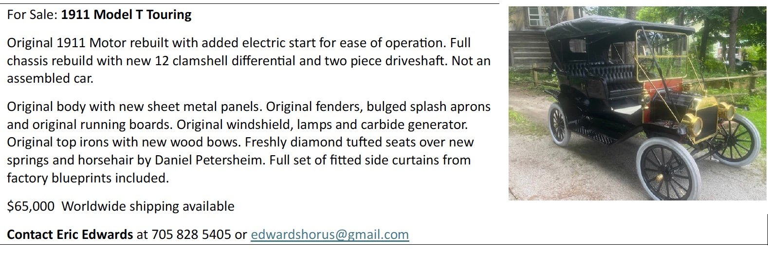 I would like to buy a 1914 or older Model T Touring for use in Parades and touring.