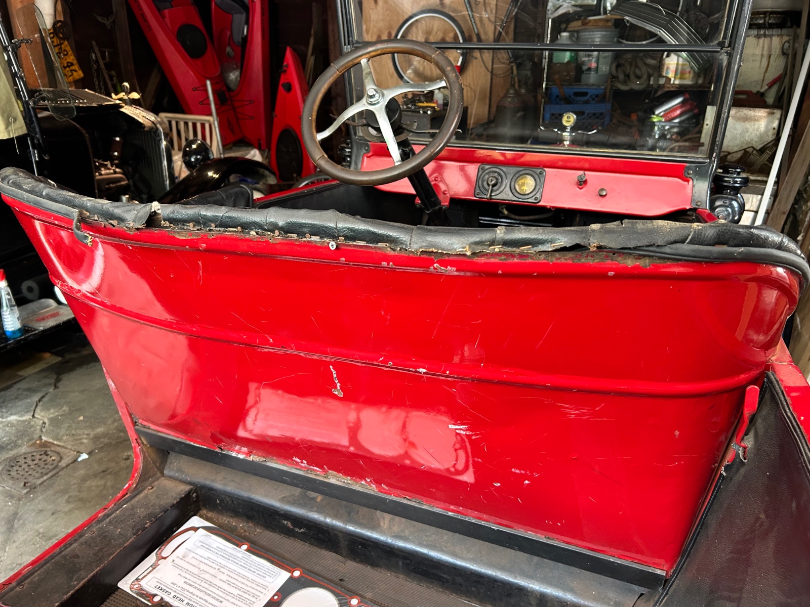 Paint is ok—but there are some chips and scratches. Some rust on the body. Upholstery has some rips. Please See photos. Body and upholstery can use a good restoration.