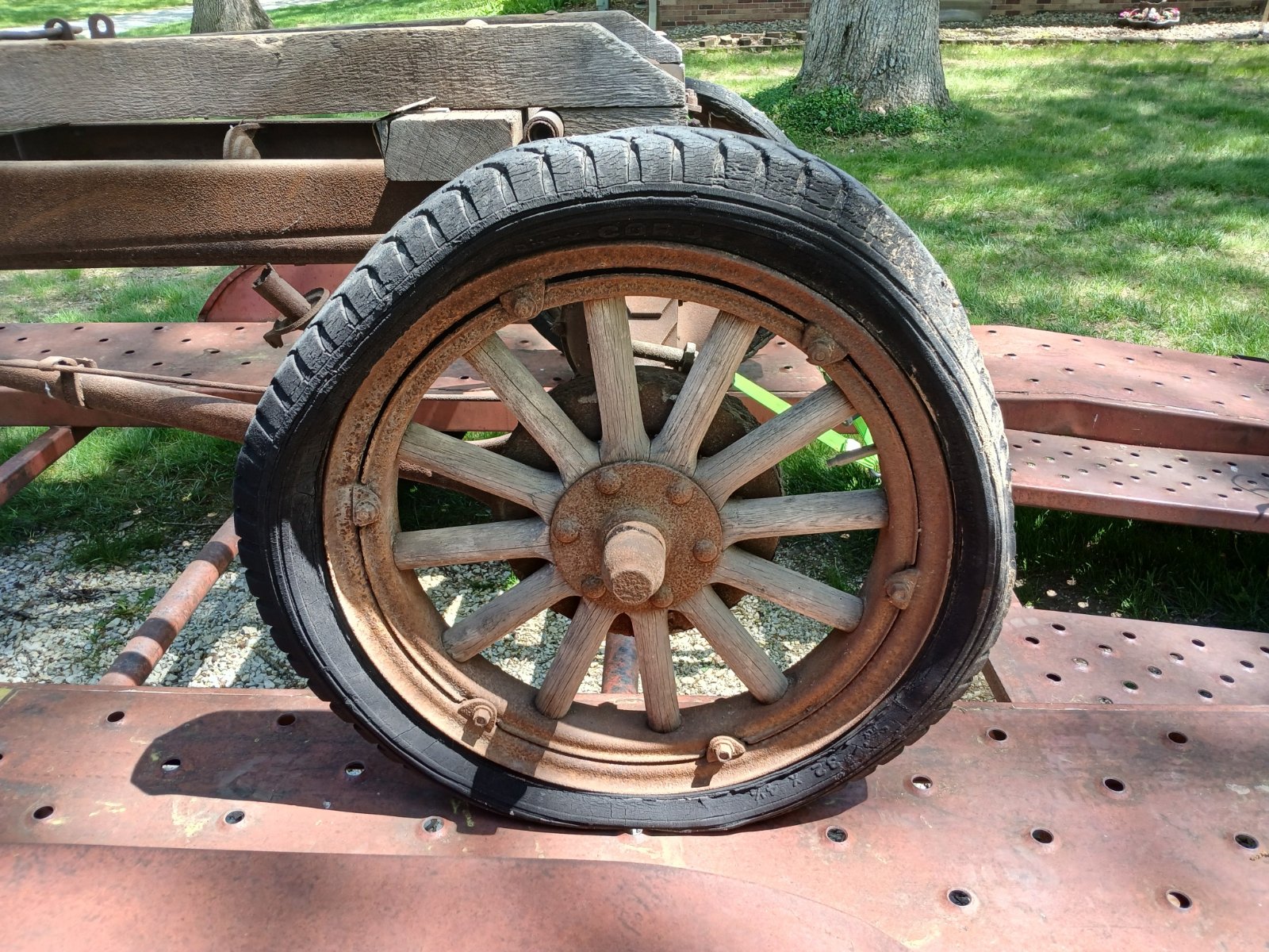 30x3.5 fronts, 32x4.5 rears, have steering column with it. Has a cool latch system for a gravity dump box, still mounted to chassis. $500 pick up in west central indiana.