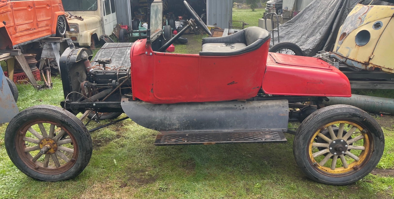 1919 Ford Model T roadster. Original steel body with good windshield, full set of fenders and such. Has a running stock engine with a distributor and coil (no coil boxes) and a High Compression Waukesha / Ricardo head and accessory water pump. The starter crapped out, so it needs rebuilt or get another one. I have too many projects and need the space back.