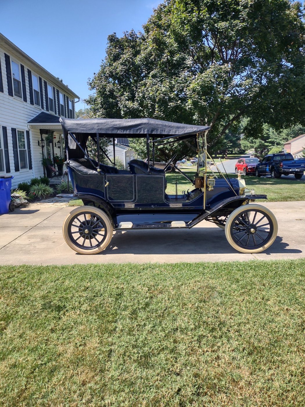 1912 Touring with slab side. Ground up restoration completed June 4, 2016. On the maiden voyage a rod went through the 1912 block 3 miles from home(previous owner restored engine but never ran it.) I kept the block and purchased another engine around 1923 I think, from Kevin Pruss. I have the receipt that tells about the rebuilt engine. The front doors were never put on the car. I have new inside panels if you want to put them on. I alsio have the door handle for the passenger side. The bungy cord on the passenger door is to stop the rattle. Over time the body relaxed and the door to body space increased. Has Rocky Mnt brakes. Has aluminum crank. Lights are not set up to work. Paint is very good with areas of minor scratch or chip. Needs new tires and has a cracked front windshield from tights screws when I pulled the top windshield down. Has leather seats. Pictures speak for themselves. Runs very well comfortably at 30-33 mph; although the phone app records that is goes faster, but I do not recommend faster. It had a tune up last week by a model T mechanic. Large mirror not included. Sandwich sign panels are included but not the sandwich sign. Won a trophy at every car show entered. Located about 45 minutes north of Baltimore. Might possibly be at a car show September 9th Seaside Heights NJ. $24,500