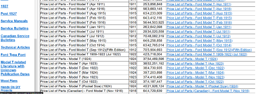 In the left margin there is a list of links to numerous books. The listings of parts books by year goes on for two pages