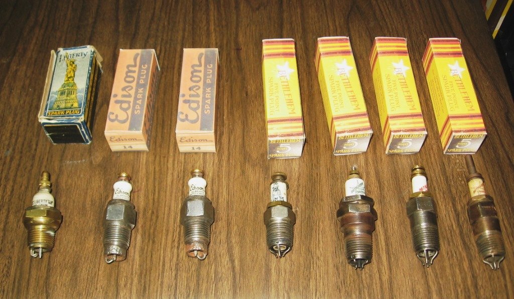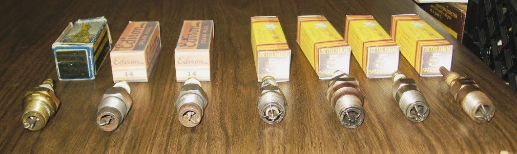 Here are eight (8) spark plugs of various brands. All are 1/2" pipe, which will thread into the head of a Model T.