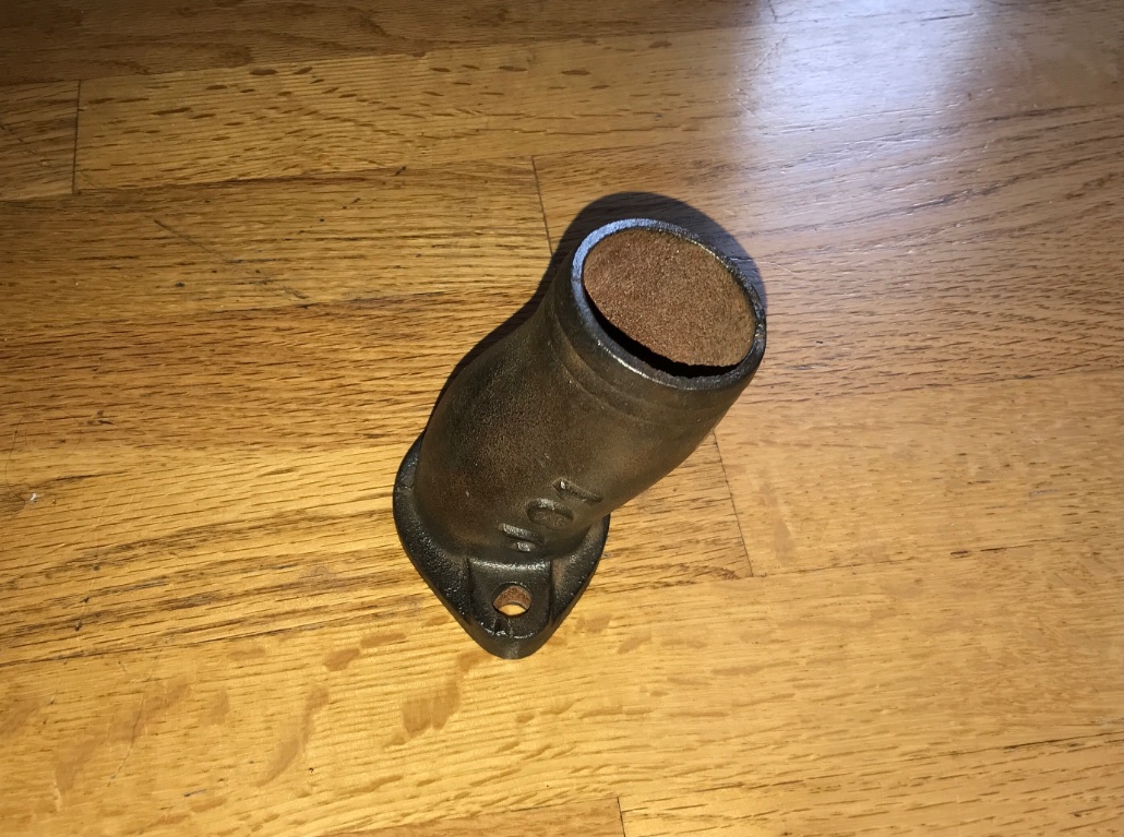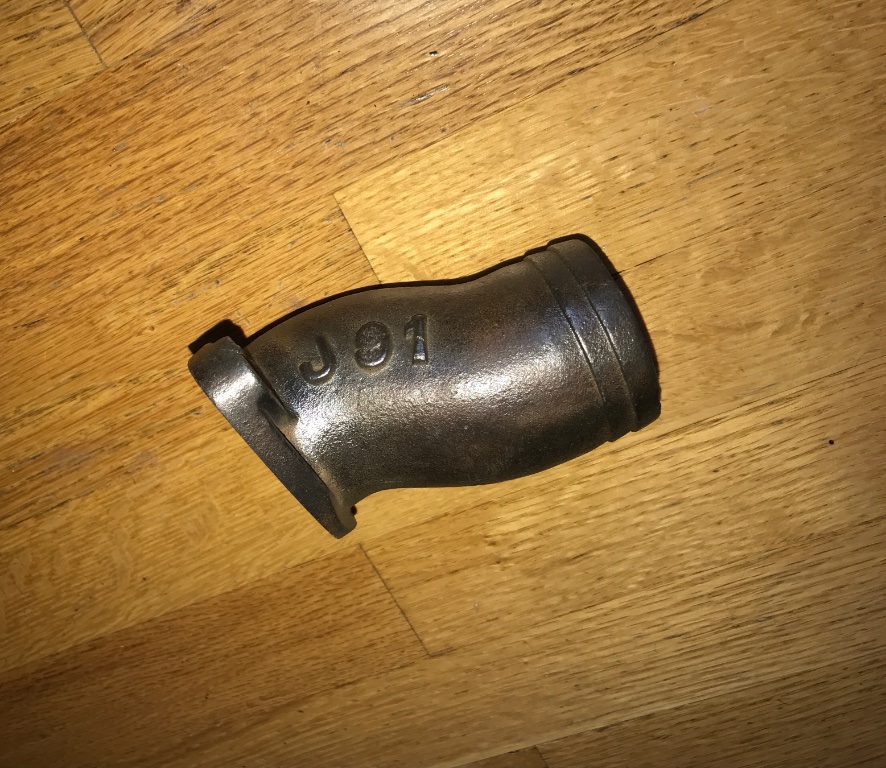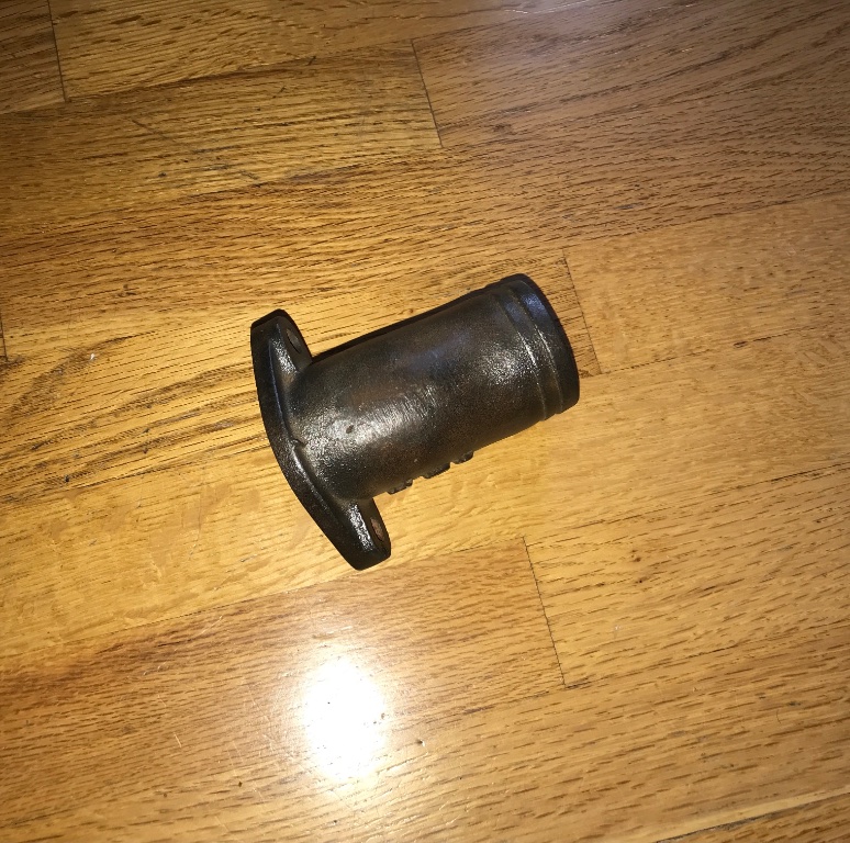 This water neck Adaptor was stored with some misc OHV speed parts. It is marked J91 and measures 2-15/16 between bolt hole centers. 4 inch tall from base. It is made of heavy cast steel. The center hole is 1-3/4. 80.00 includes shipping.