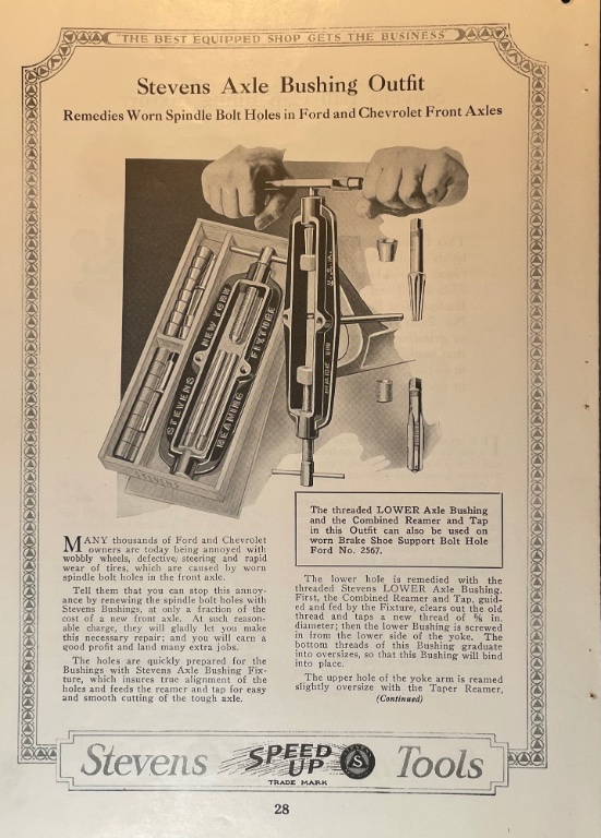 This is a complete Stevens Front Axle Repair tool for the Model T. This set of tools is used to replace worn out tops and bottoms of the front axle yokes that result from driving the car when the spindle bolts are loose. A worn hole on the top is replaced with a conical bushing, and stripped threads at the bottom of the yoke are placed with a threaded insert. This set is complete and includes the Stevens frame, the top and bottom reamers, the two alignment rods, and enough of the top and bottom bushing to repair both sides of a Model T front axle. This set of tools is in very good condition. The original Stevens reamers are in good condition. The original paint on the frame is still intact. The original wood box is included, but the lid has disappeared. $675 shipped within the continental United States.