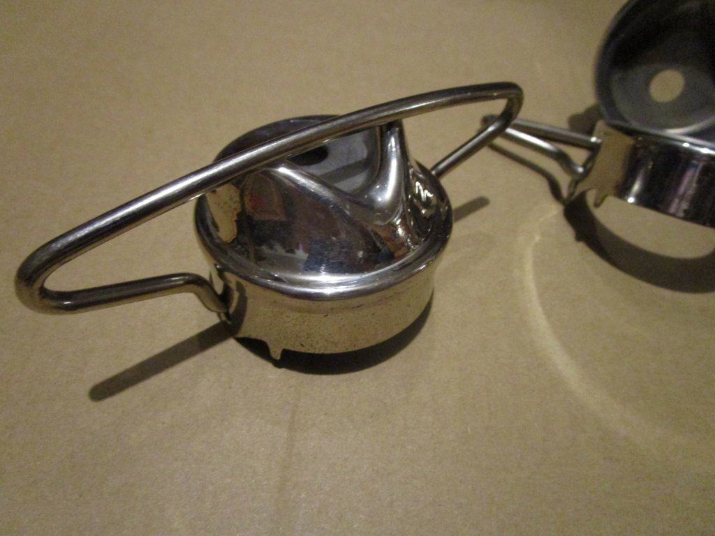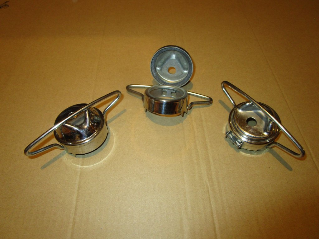 They are in NOS, lightly shelf worn condition. I would give them a 9 out of 10. They are nickel plated brass and the nickel is not peeling or flaking. Every one of them that I have had, has had very small stress cracks at the little tabs. It more than likely was a manufacturing defect. They are very small and hard to see but I wanted to mention them. They will not hurt the use of the item at all. I have shown a close up of an example of the cracks. The small repro moto-meters sold by the vendors fit the flip cap nicely. To install the flip cap assembly on the radiator neck, you remove the "bail" from the assembly, fit the assembly to the radiator neck, and then re-install the "bail". The "bail" holds the assembly in place. They come with two graphite/paper gaskets. I have used these on several of my cars. I install them with a thin layer of clear silicone sealant to the gaskets to help seal and holds them in place better.