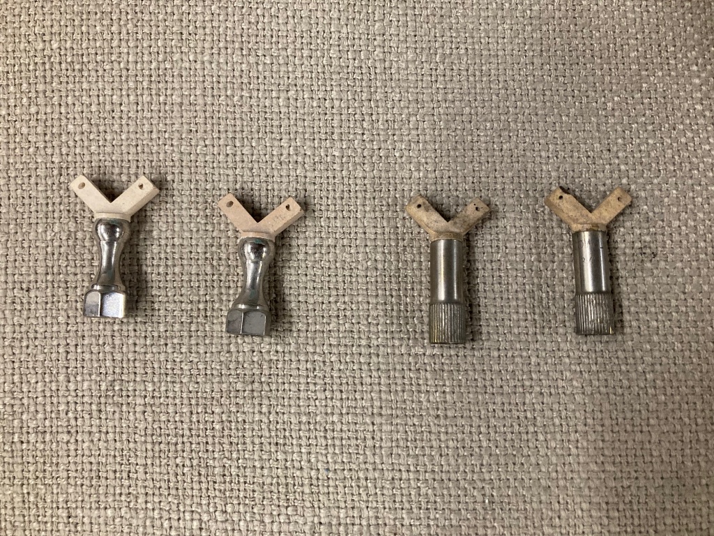 2 pairs of burners available. The knurled pair appears to be very nice originals with decent nickel (silver?) plating. The hex set appears to be new reproductions with excellent chrome plating. $60 per pair delivered in the lower 48