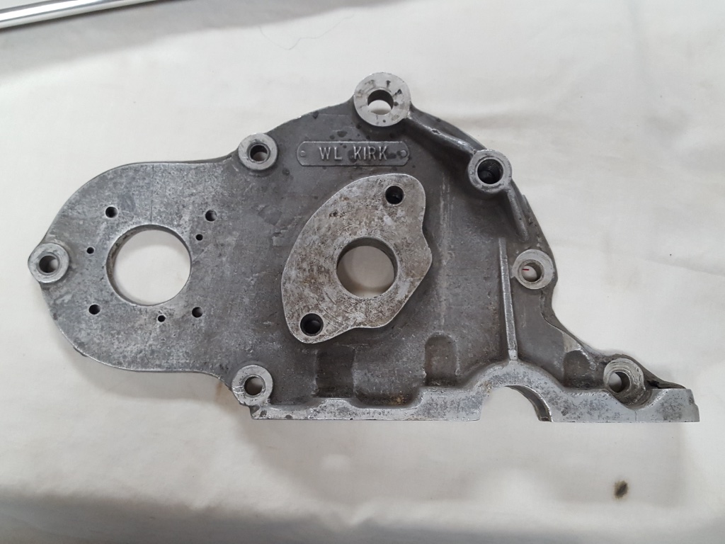 Original Kirk front plate to put an oil pump on a Model T block. $300, domestic postage $15.