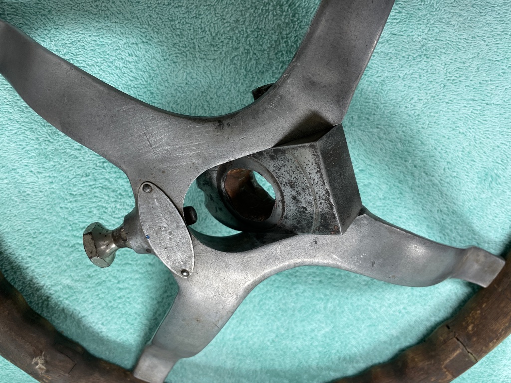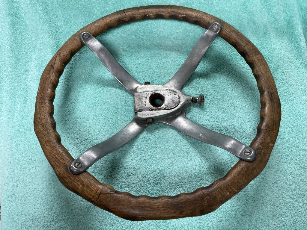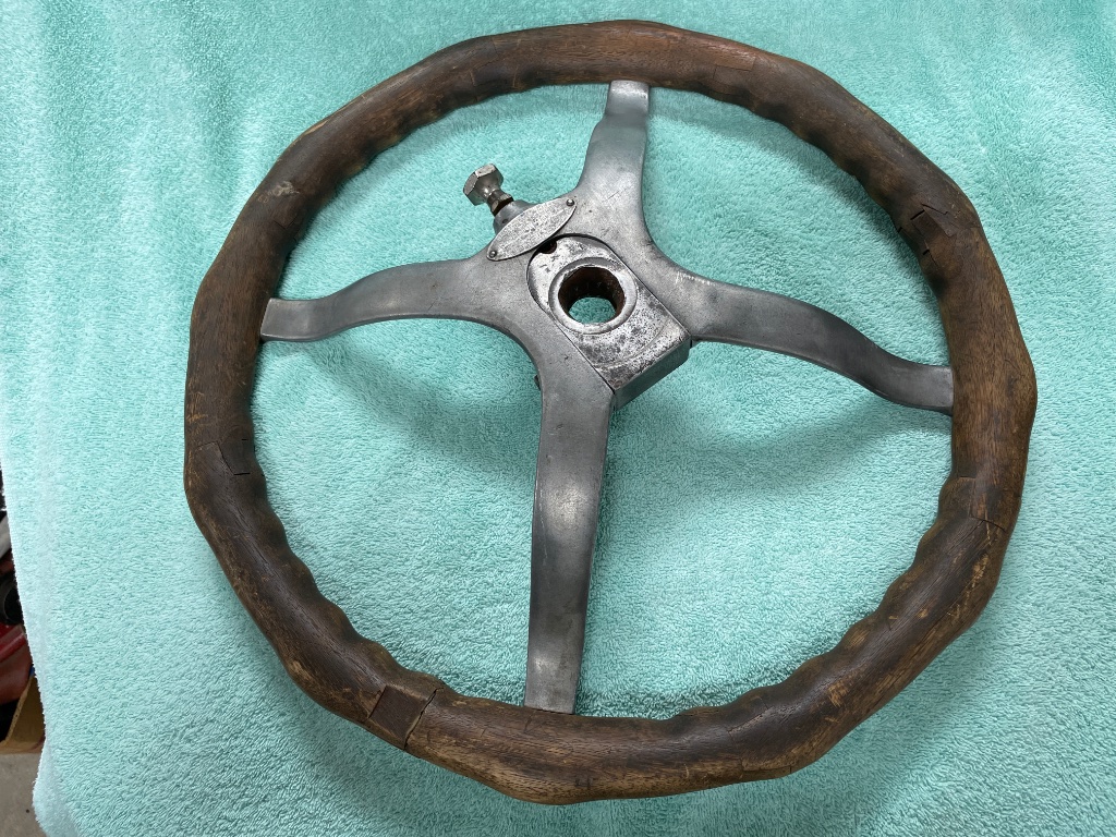 Very good wheel with wooden rim, will need a bushing in the center. Sold