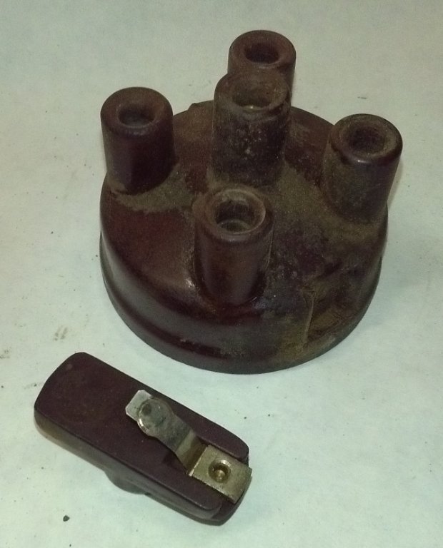 Tornado clip on distributor for parts- the potmetal is badly cracked and unuseable, but the cap and rotor are on good condition. There are no points in the distributor.