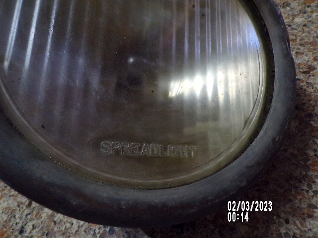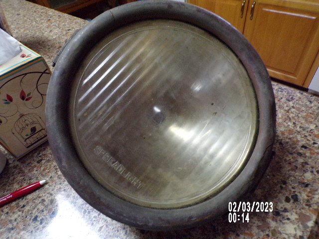 Early electric headlight with lens. Fits very late 1914 and early 1915 Model T Ford. This is the time when they were phasing out gas and bringing in electric headlights. Brass rim has a few minor cracks. As mentioned above has very good Spreadlight lens. $75