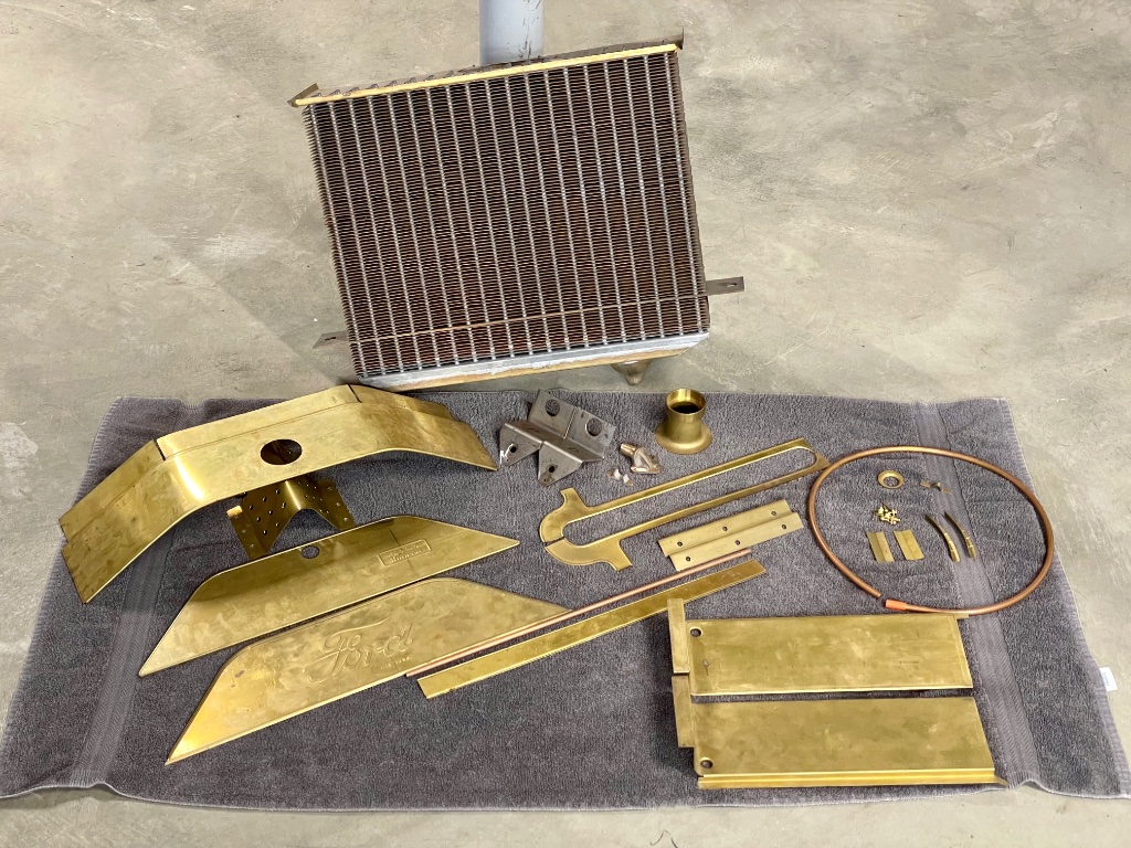 1913-1914 early 1915. Bergs Made, Round Tube Radiator Kit. Very nicely made components and much heavier gauge material when comparing to a Brassworks. Inlet and outlet connections are solid cast brass , and core fully soldered by Bergs. High Quality.