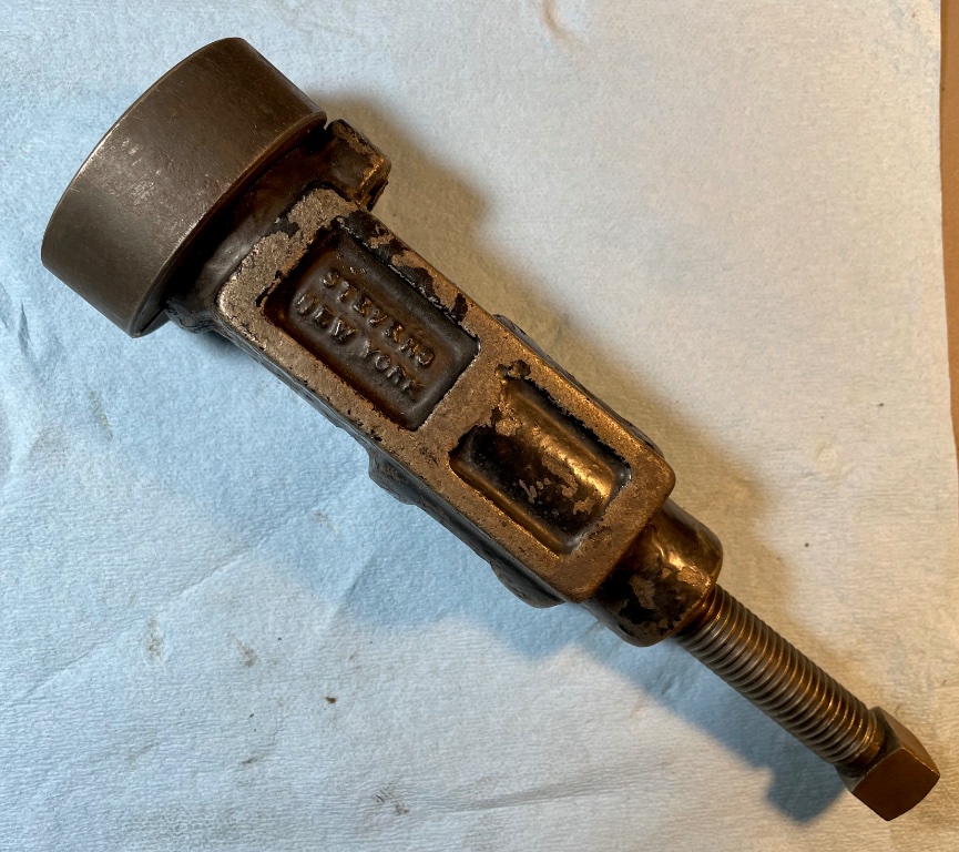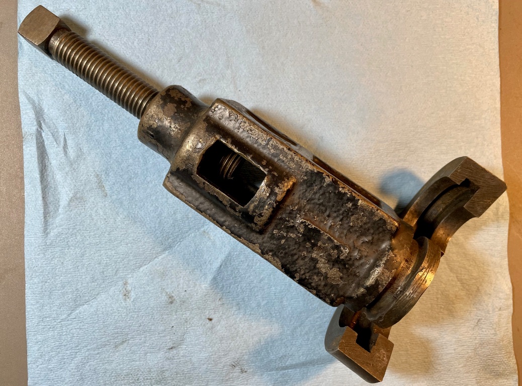 This is a less common example of the Stevens, NY T-122 drive shaft roller bearing sleeve remover. This version has a cast iron body and uses two steel half moon clamshell pieces to capture the sleeve while pulling it off the end of the drive shaft. Later pullers were made entirely of steel and used a different capture mechanism. This tool was included as part of the Stevens Drive Shaft Overhaul tool kit. We would suggest using a worm gear hose clamp around the steel half moon pieces to keep them from slipping off the drive shaft sleeve. The puller is in good condition. $300 plus shipping.