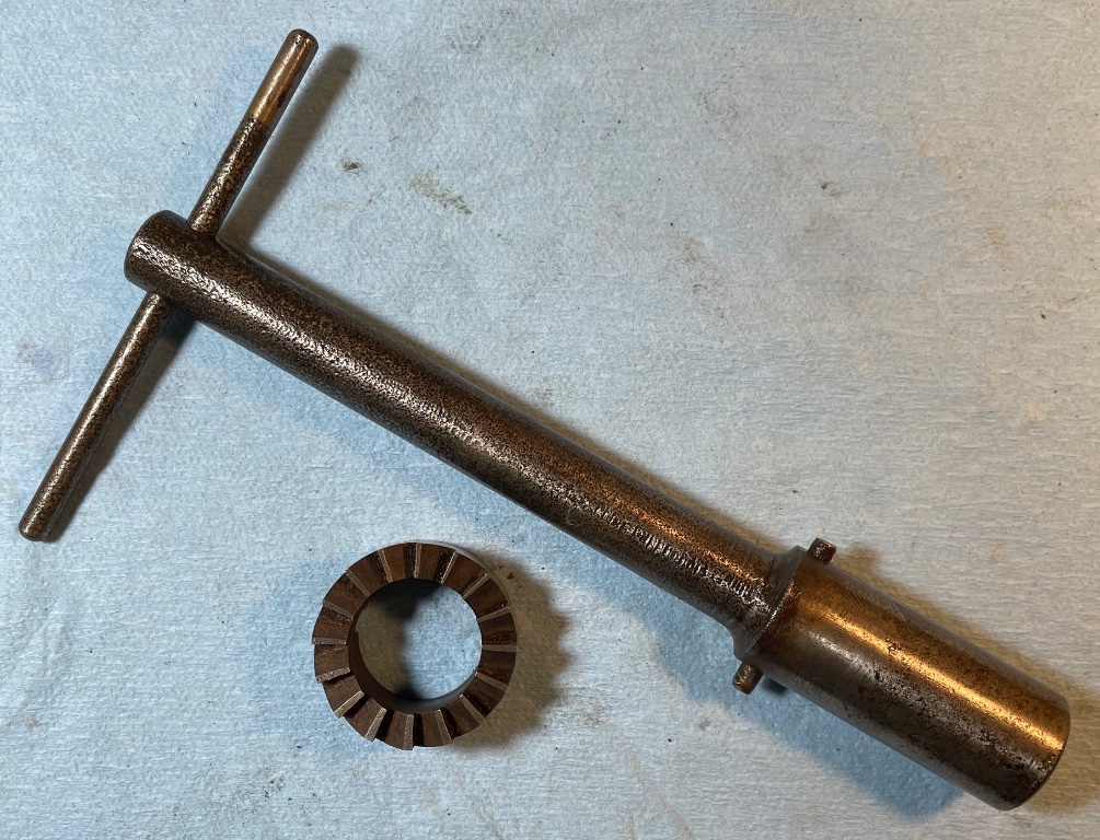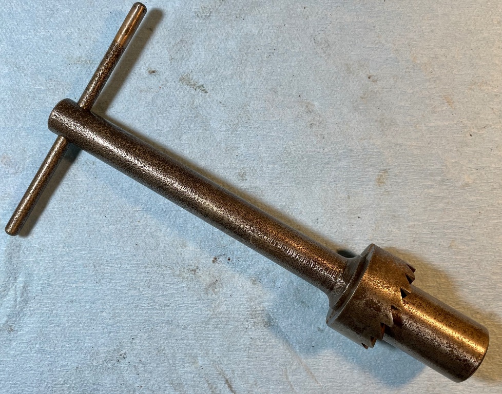 The handle of this tool shows some rust pitting, but the cutting edges and guide pinion are in good condition and still cuts well, in fact better than new reproductions of this tool. The top surface of the end mill is marked KR Wilson Buffalo, NY. This is scarce but necessary tool when replacing the drive shaft bushing when overhauling the drive shaft. $200 plus shipping.
