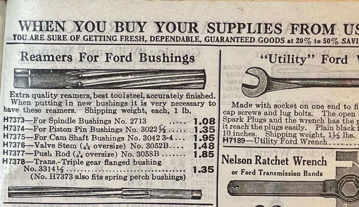 For Sale: The Western Auto Company was an aftermarket automotive parts supplier during the early 20th century. Their catalog offered a full line of accessories, replacement parts, and tools for the Model T. This is a Genuine Western Auto reamer for fitting piston pins. It is marked 3022-1/2 and with the Western Auto name. It was used when fitting new bushings in original Model T bushings. The reamer is in very good condition, still quite sharp. $50 plus shipping.