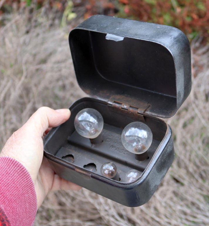 This is a nice period case to safely carry your spare headlight and tail light bulbs in your car. Made by the Dover Stamping And Manufacturing Co. Patented Nov 23 1915. The Bulb's securely spring load into the case sockets. Comes with the bulb's you see. Asking $65 plus postage.