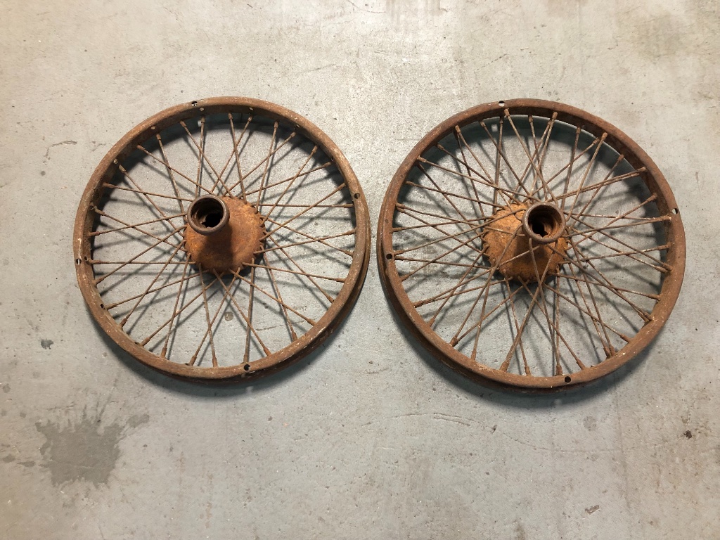 Offered here is a pair of front accessory Hayes wire wheels. They are the 30 x 3.5 size. The outside rims are in great condition. One is missing the front spokes. These accept regular 30 x 3.5 inch demountable rims and fit directly to model T spindles using regular bearings.