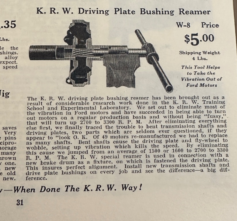 More info to help in my quest: KR Wilson reamer marked W-8 sometimes on the square drive end flats. About 13" long; shank 1" Dia.; cutter end reams Driver Plate bushing to 1" I. D. in Model T transmission when bolted to brake drum to ensure positive alignment of all three bushings when rebuilding transmission.