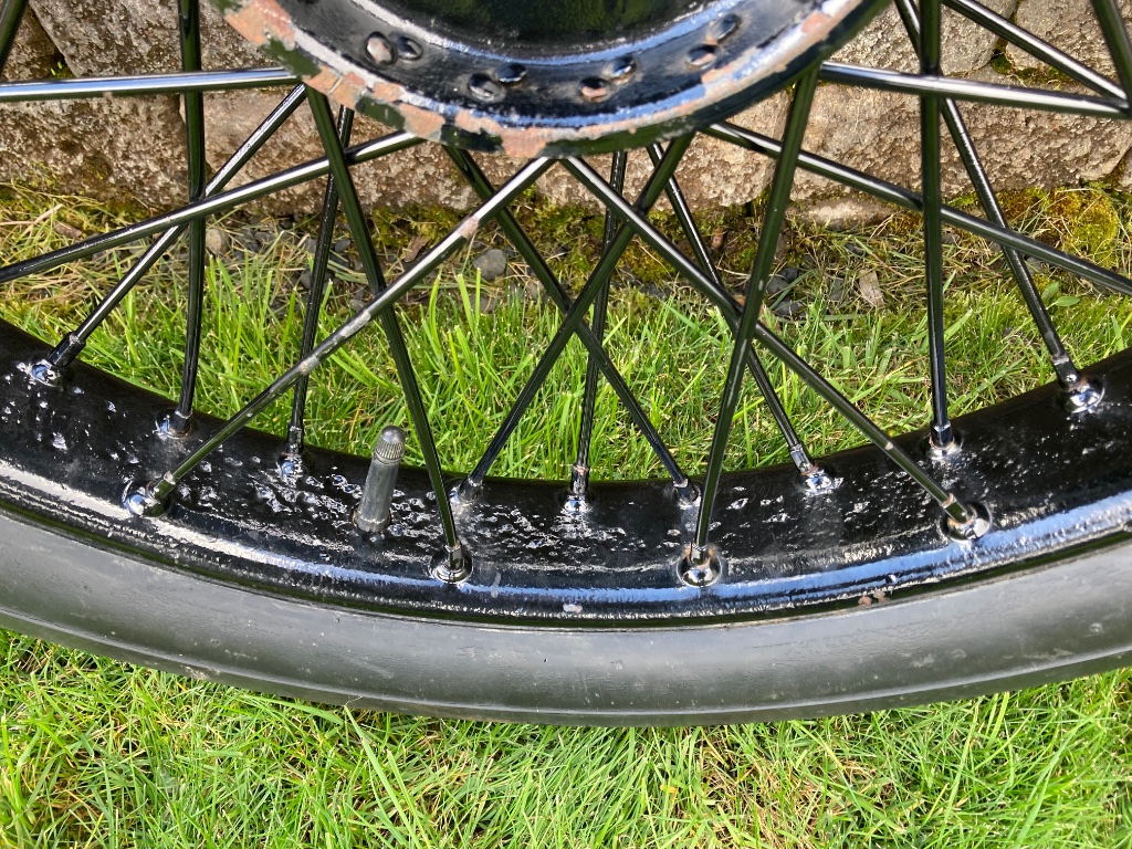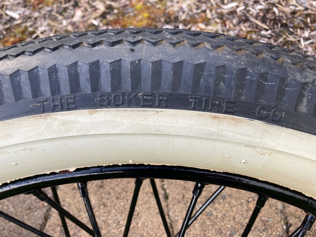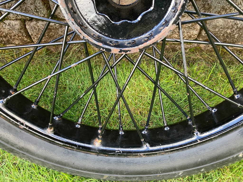 This is a nice solid set of wire wheels with Coker white wall tires. 30 x 3-1/2 Tires have never been run. No bent, loose, or missing spokes. There is some pitting on the rims and some flaking paint. Overall a nice set of buffalo wire wheels.