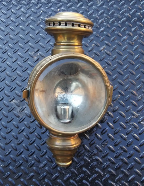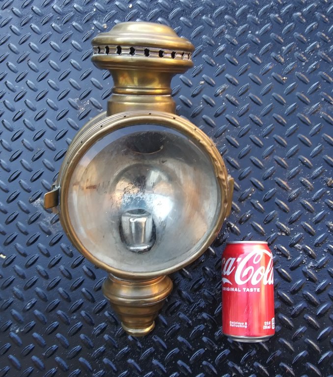 Here is a great, European or British all brass lamp. This could be a very large side lamp or a headlamp. It is all brass and is in nice condition with a good beveled lens. Very high quality. It measures about 16" tall and 7 3/8" rim and 6 3/4" in depth. A great lamp that would date from approximately 1900-1905.