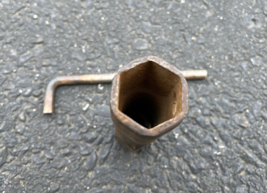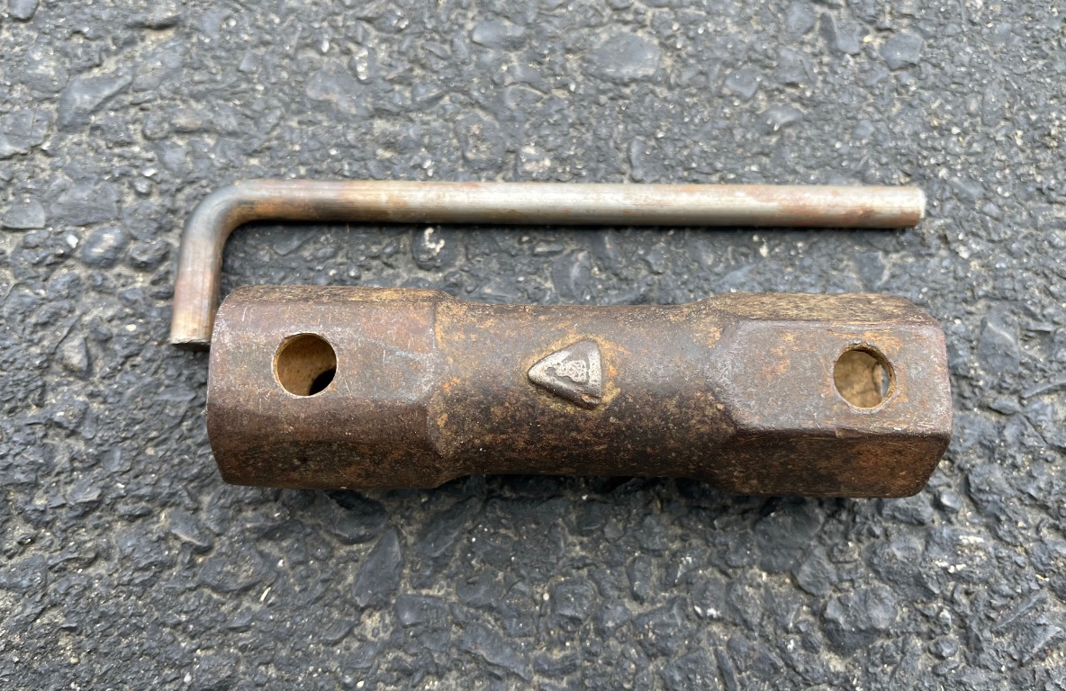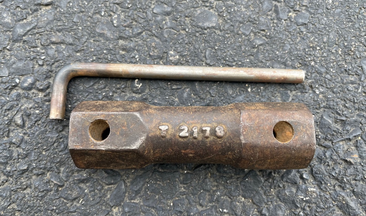 This is a T-2178 (also known as T-1904) spark plug wrench that was included in the tool roll sometime in 1911 and phased out in 1913. Very hard item to find. The rod is not original.