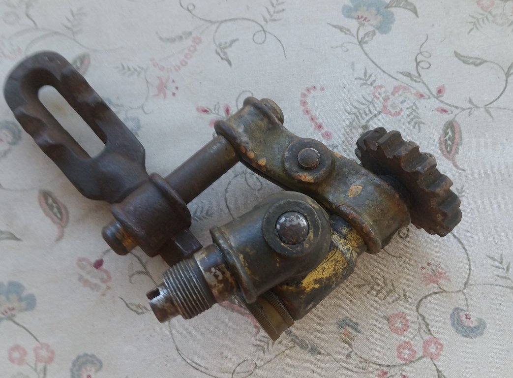 This looks like a Stewart but not marked that I can see . Spins freely in both directions. Bracket has a crack that will be an easy fix.