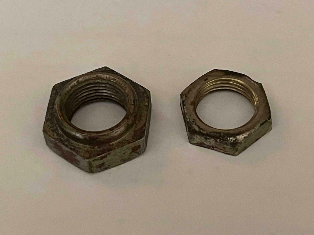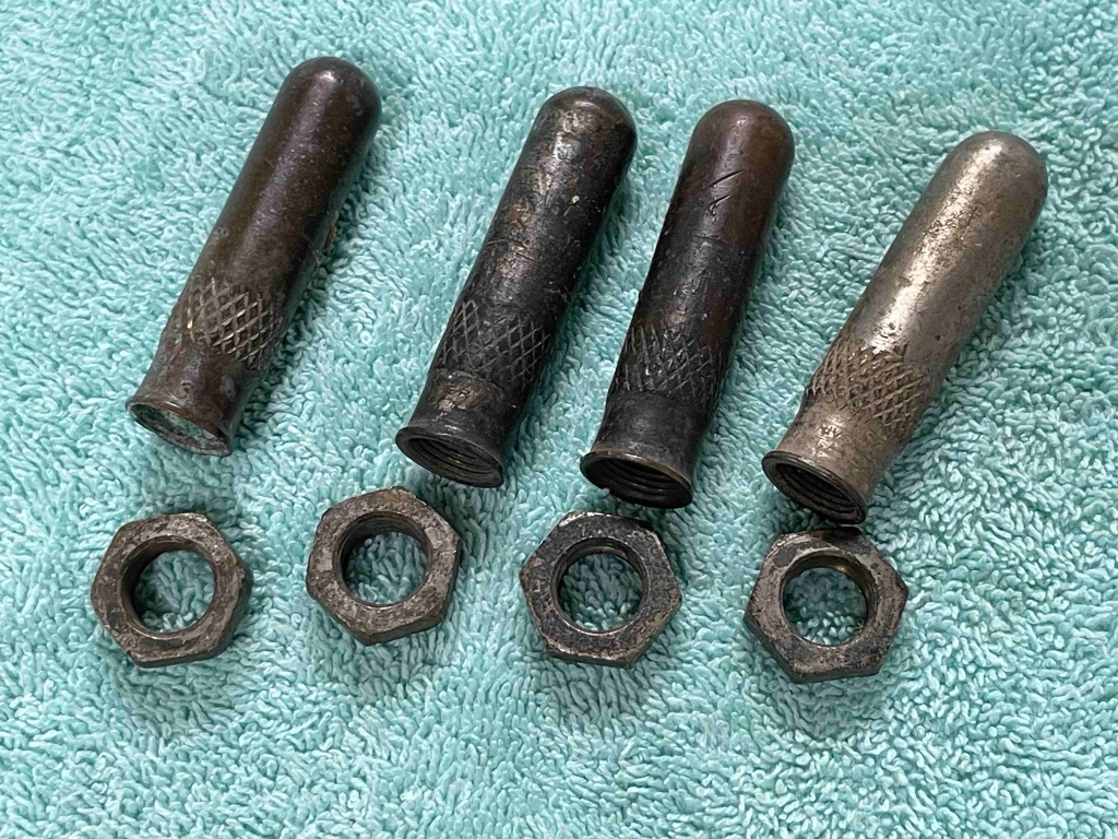 The rim nuts that have threads both inner and outer are for later smaller diameter .406" stems. They are of stamped construction.