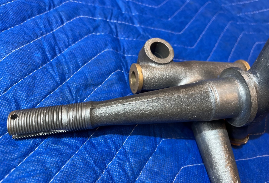 Pair of 1911-1917 style spindles. Will need new bushings. Both have grooves from bearings. Threads are a little worn but bearings thread on.