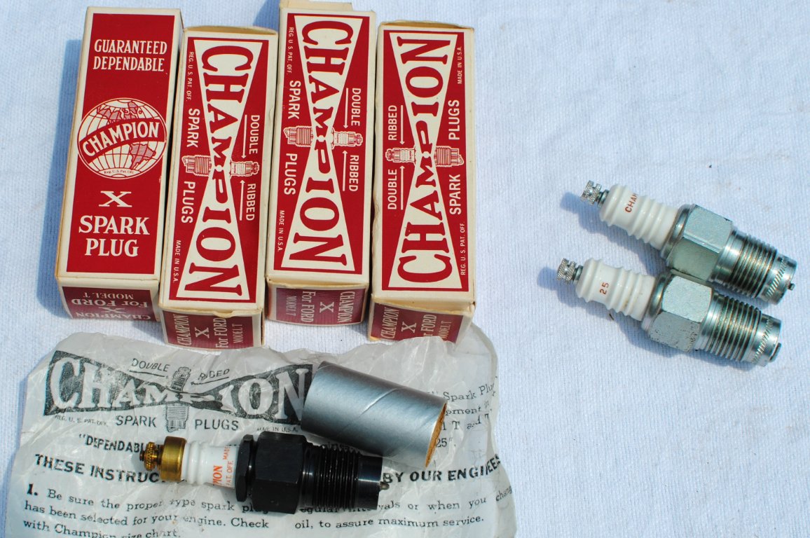 Four Champion X for Model T plugs. New in box. These four come apart. (Catalog price is $145).