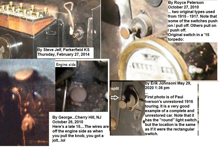 This is an original 1915 push/pull light switch (see 1915-17 Parts Catalog). The next version (1915-16) has a rectangular mounting plate and a longer body then the next version (1916-17) which is similar to repro switches. The split in the brass mounting plate appears to be a manufacturing issue in that it was picked to the body. In the attachment of several examples of them in cars, one also has a split.