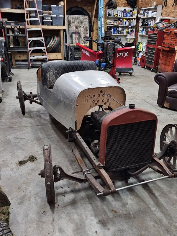 boat tail speedster project. It's on a T frame with T engine (which i know nothing about). The rear was lowered using a Back in the day method and the front end also inspired by a 1920s racecar (Pasco body). The front end is a Essex front end. The guy i bought it from is a professional fabricator and did a nice job with it. Body is hand made with aluminum.