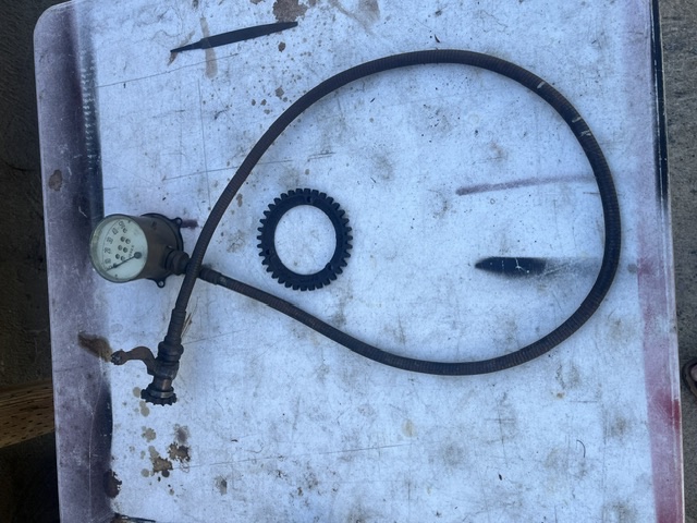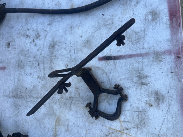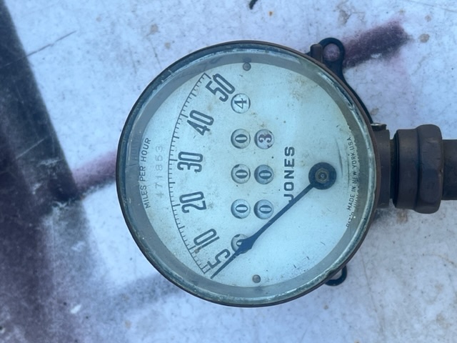Complete Jones speedometer set up. Brass Jones head, inner and outer cable, 1 to 1 drive with bracket and Jones wheel gear. Everything is in nice condition. $850.00. Original torpedo sediment bulb with original drain valve and gas valve. $200.00. Front axle license plate mounting bracket, says Ford front axle on the front. $100.00. Radiator neck front license plate mount, model T,pat 1911. $100.00 all plus shipping.