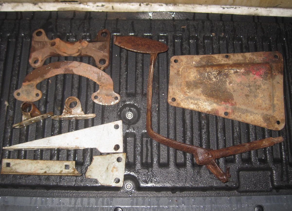 Misc parts: Early front motor mount with a broken off bolt, $5. Used parking brake quadrant $5. Worn Control shaft blocks, $2. Pair late firewall brackets, one is broke in two, the other is OK, $2 for both. Transmission cover $5. 26-27 clutch pedal, needs straightening, $5.