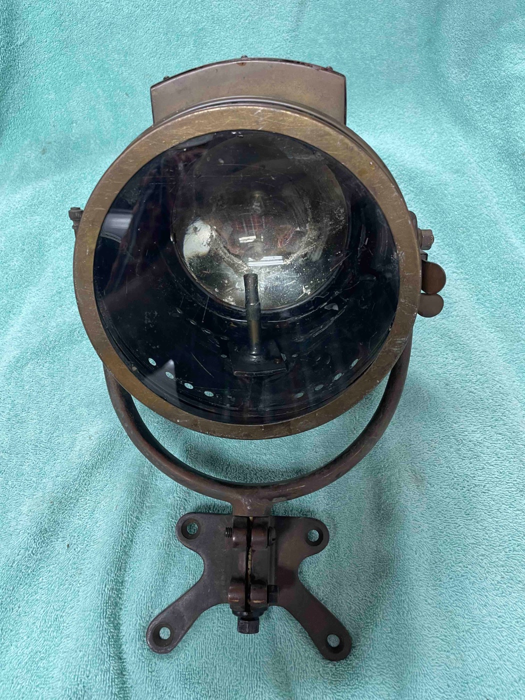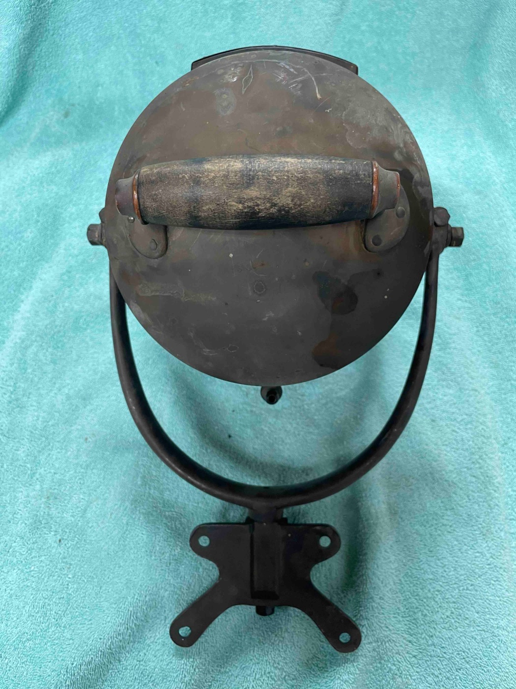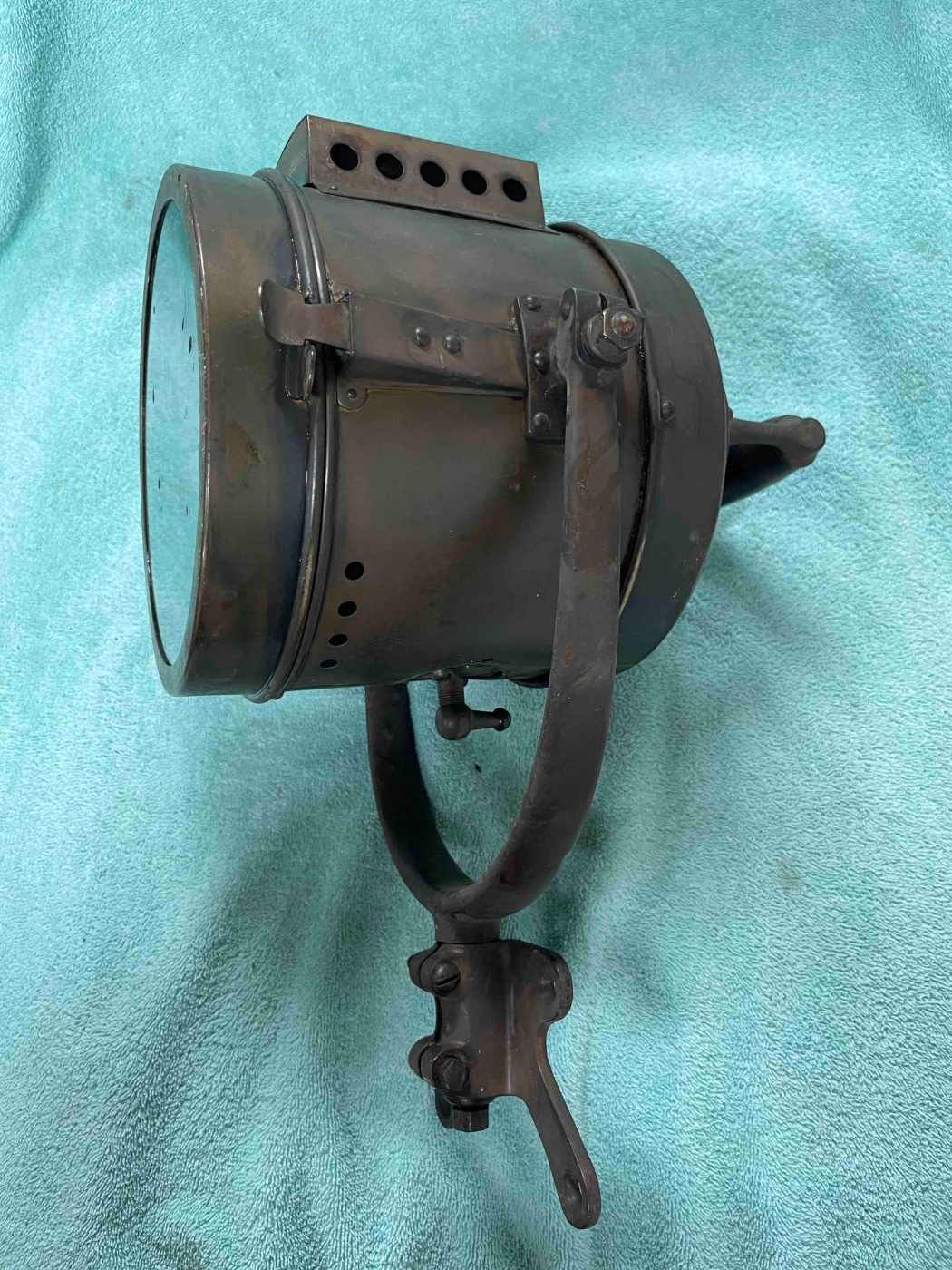 All brass spotlamp complete with swivel for firewall mounting on early speedster, 7" diameter lamp, assembly is 14" tall. Nice glass reflector, no cracks or dents, wooden handle on rear. $435, 48 state shipping $40.