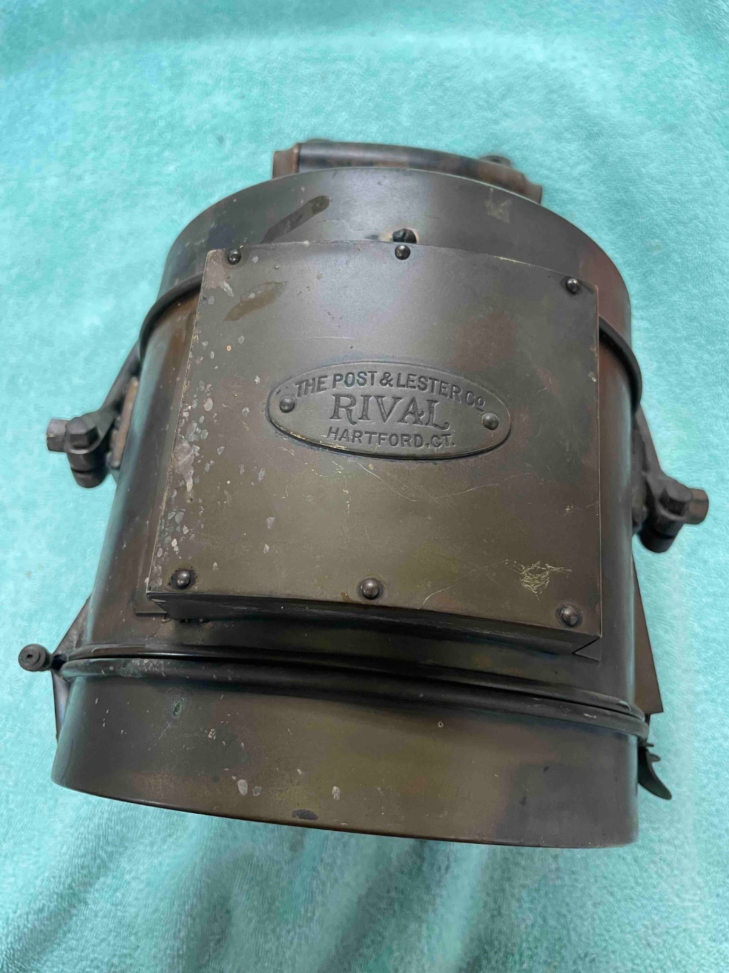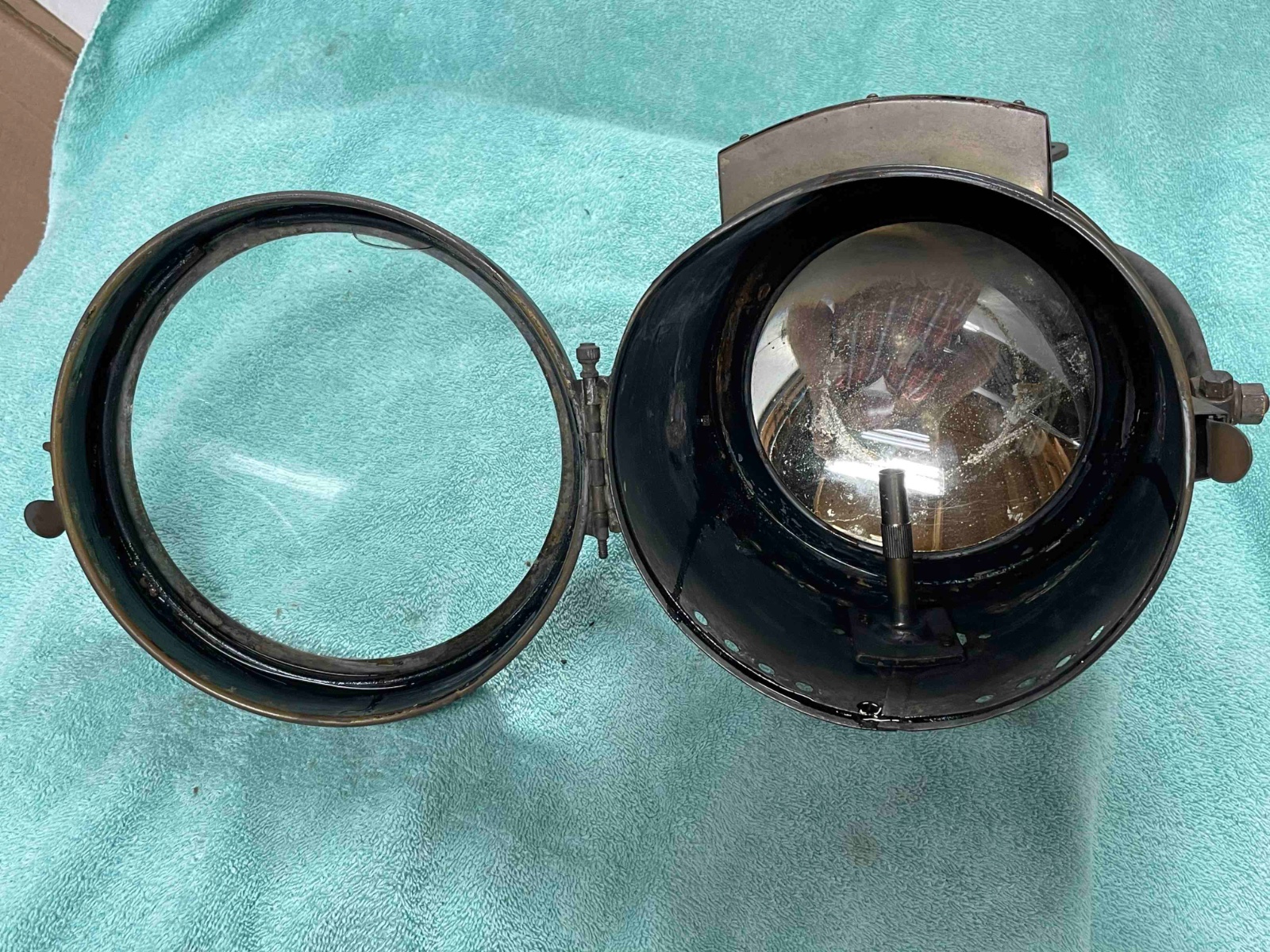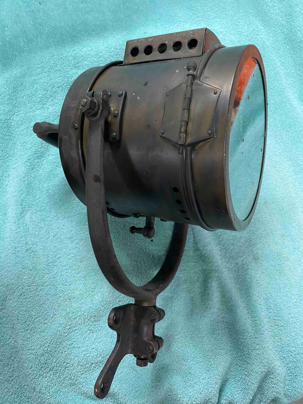 All brass spotlamp complete with swivel for firewall mounting on early speedster, 7" diameter lamp, assembly is 14" tall. Nice glass reflector, no cracks or dents, wooden handle on rear. $435, 48 state shipping $40.