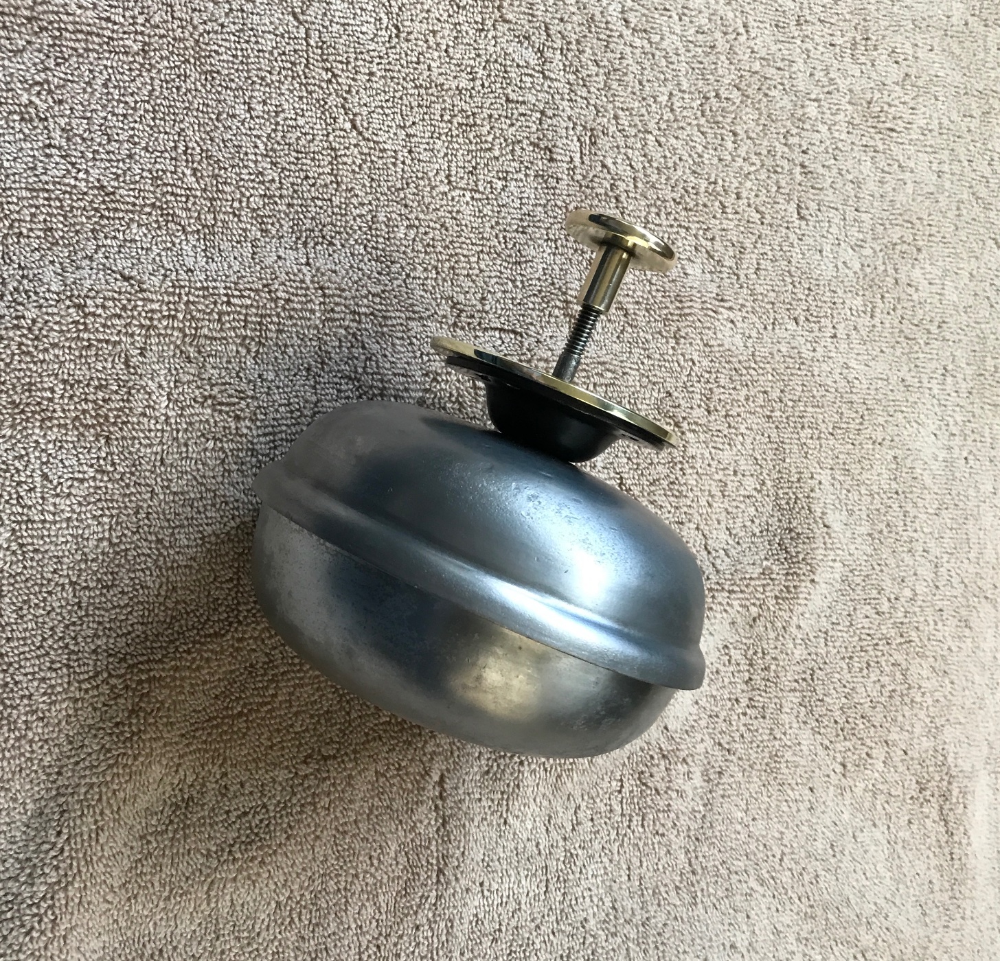 Here is an original T era Bermuda carriage foot bell. It is made of nickel plated steel. It is in excellent working condition, and puts out a loud “DING DONG” when the plunger is depressed with your foot. It mounts under the floorboards with the plunger sticking up. The 5-1/2 bell has no serious damage, just remnants of the original nickel plating present, with some weathering, small scrapes and scuffs, and tiny nicks here and there. It has a solid brass 1/8 thick faceplate to complement the brass plunger knob. 250 includes shipping.
