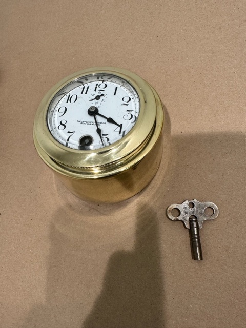 F.S. Very nice original Brass era dash clock made by the New Haven clock company, New Haven, Connecticut. The case was recently buffed and polished. It is in beautiful condition as is the face, glass and bezel. The clock was running but sat in a showcase for years and it is not running now. The second hand is loose also comes with its original key.
