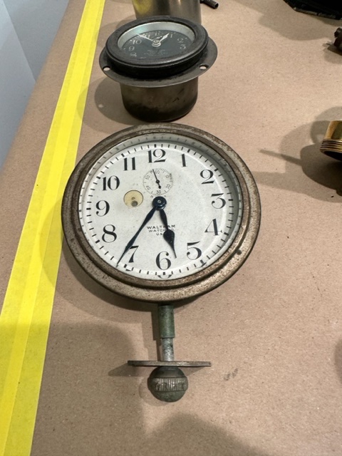 F.S. Nice original dash clock made by the Waltham watch company. This is a large dash clock that measures 4 1/4 inches across the face. It still has its original lower dash mounting bracket attached to the stem as well. As with the other clocks I did not wind it, but gave it a little shake and it ran for about 15 minutes.