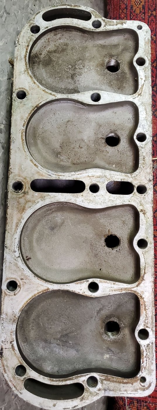 According to the brain trust this is a Reeder high head with standard model T plug holes. I do not see any oxidation in the water jacket. According to the former owner of the head, it was installed on a friend of his T and immediately blew the head gasket. I do not see any indications as to why or if that occurred. Very little indications of this head having been installed, I can see milling marks still on the gasket face area, but wife said our T is fast enough so off it goes.
