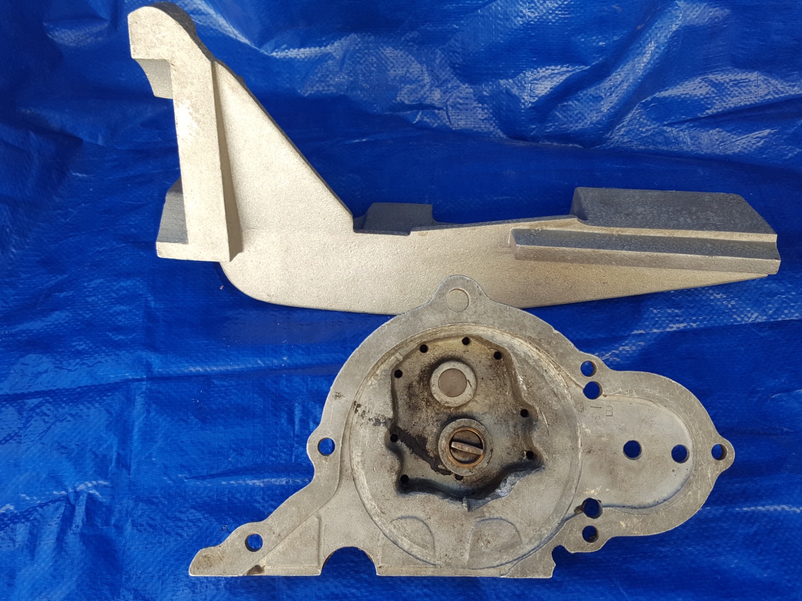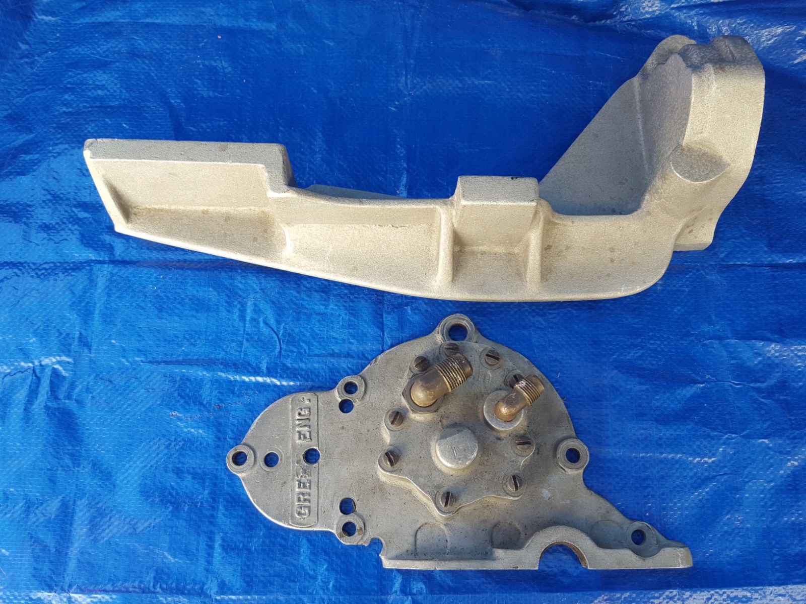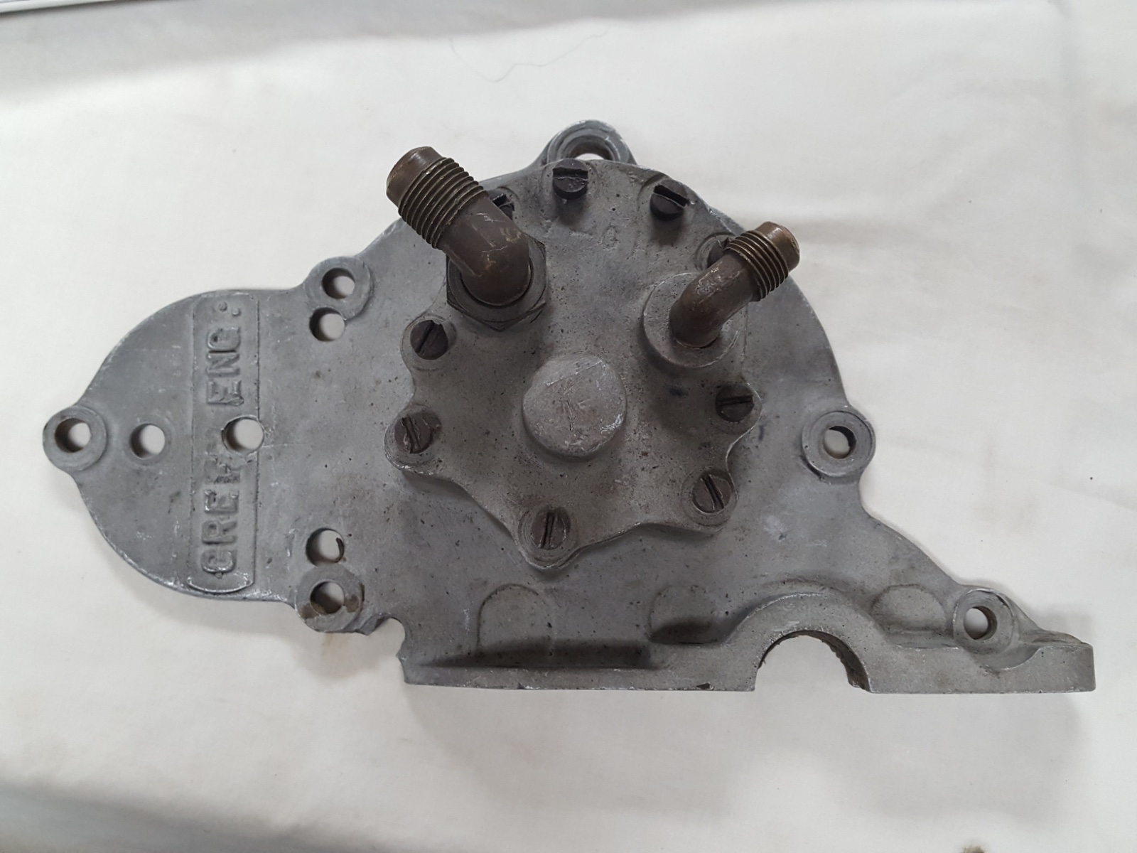 Original Green Engineering front plate with oil pump, included is reproduction casting for side drive water pump and magneto. Asking $950 for the pair.