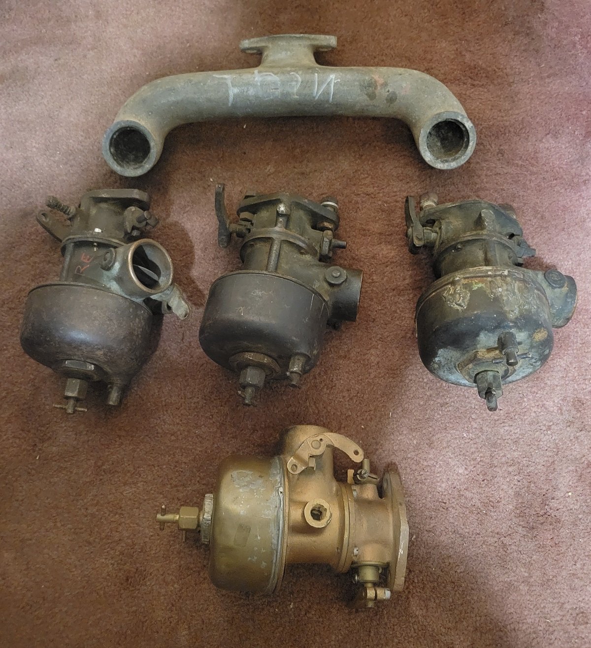 FS: An assortment of U&J carburetors and one manifold. Two of the carburetors are in "Barn Find" condition and are probably rebuildable, one has been modified (more like experimented on, a different venturi and main jet were installed and the idle jet was modified) and the fourth one (the one that's been bead blasted) is probably good for parts only, the body of the carburetor is tweaked badly. Of course the float bowls are all badly cracked except for one of them which is steel. A manifold is included but it may or may not be correct for U & J, but it's close. U & J was one of the better aftermarket carburetors apparently, and they do have a following. Asking $325 for the whole pile not including shipping.
