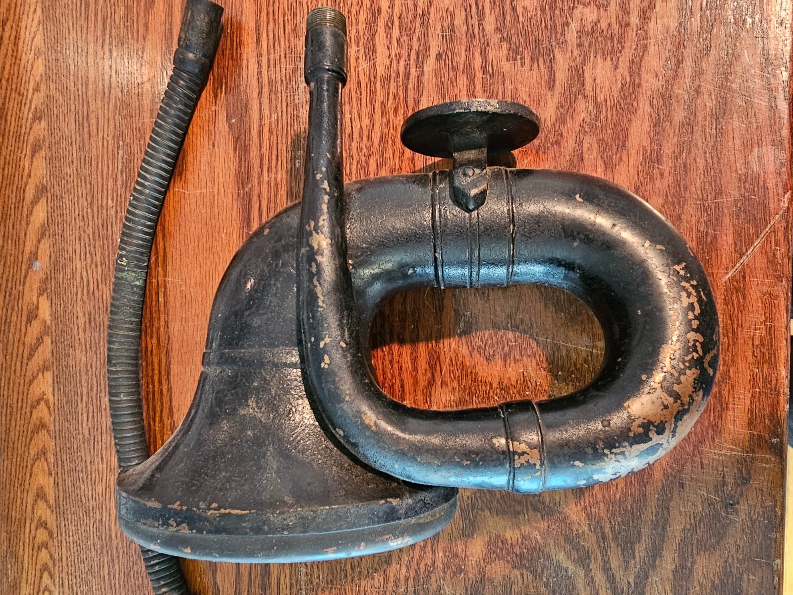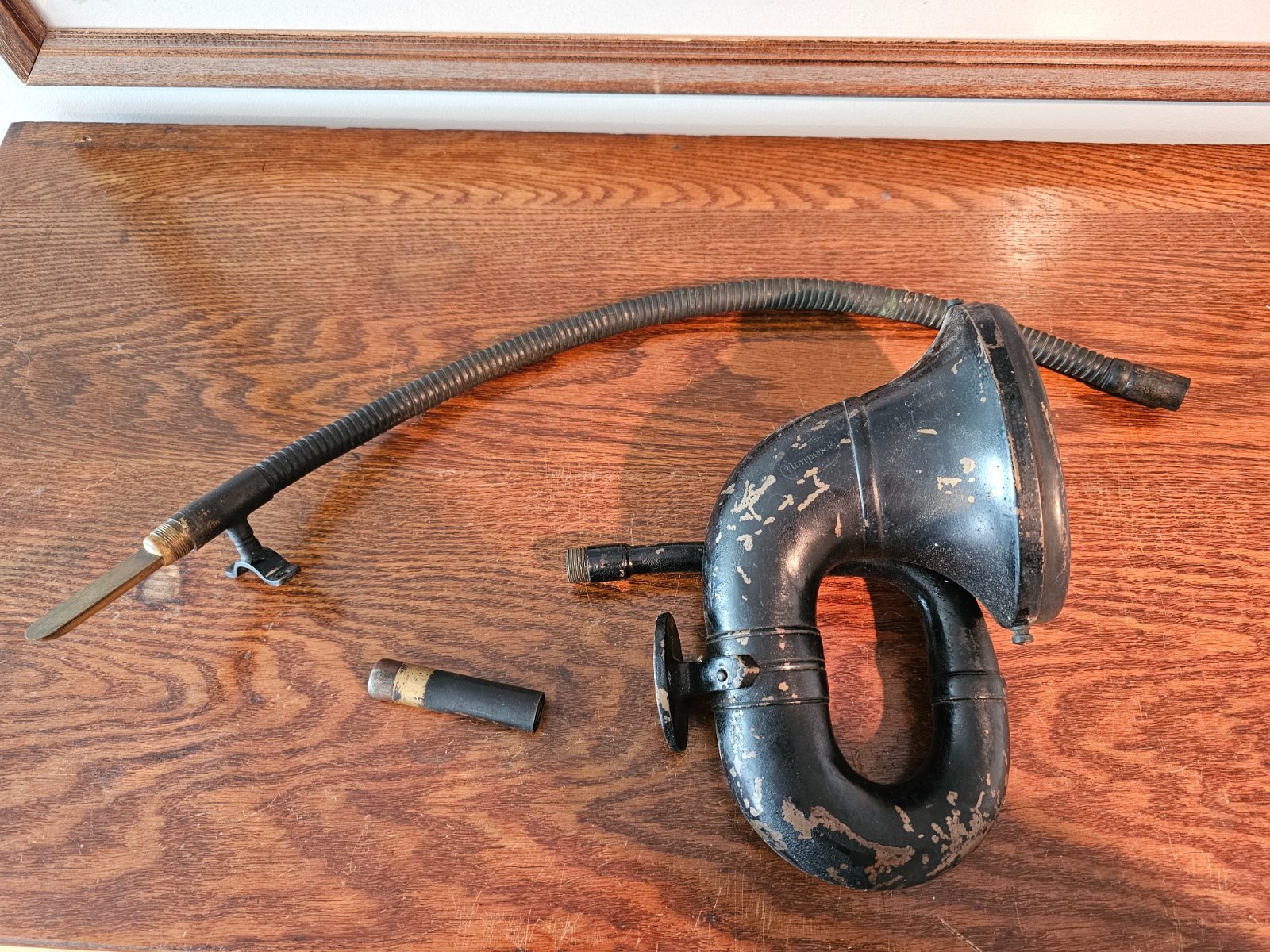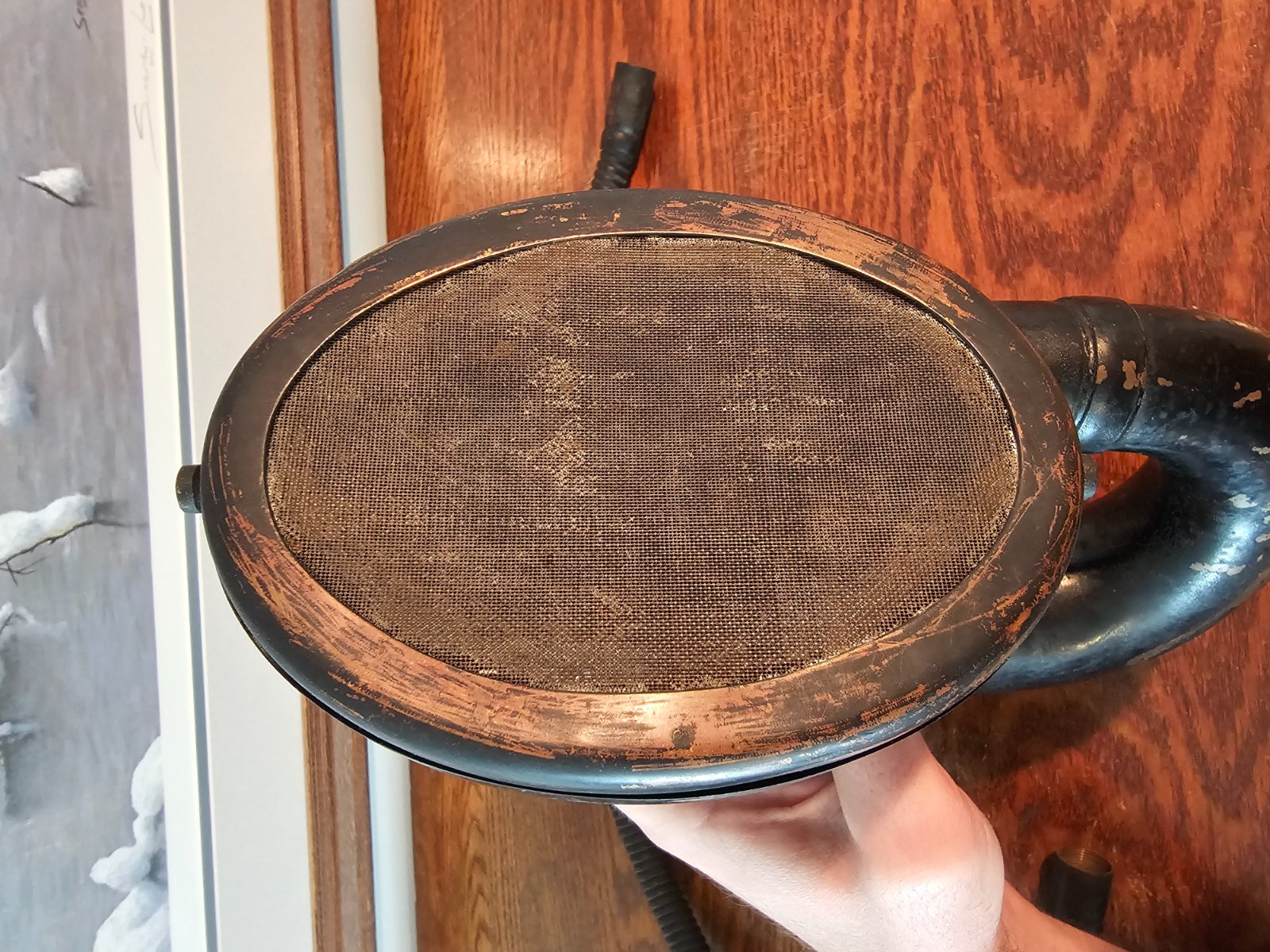 Very nice original brass horn, the paint is flaking, but I don't see any dents in it aside from some very minor ones around the rim of the screen and overall looks to be in excellent condition. Seems to work fine if you blow through it. Asking $300 plus shipping, make an offer.