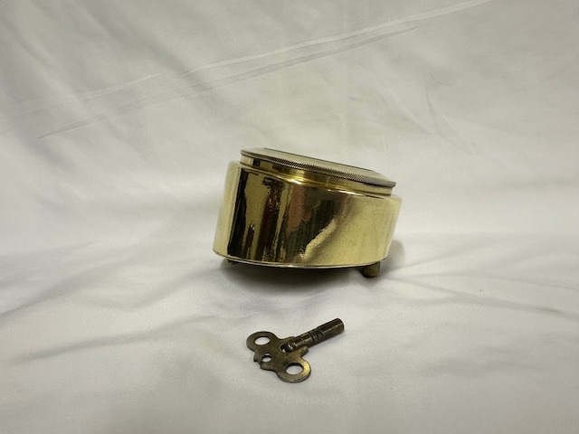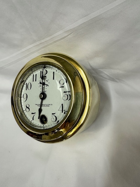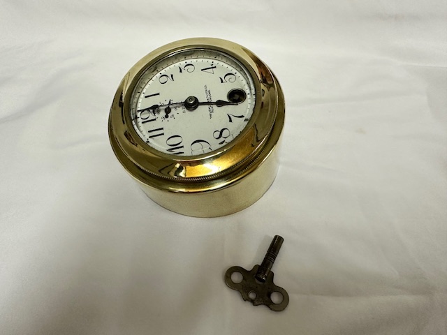 This is a beautiful original brass Dash clock made by the New Haven clock company, New Haven, Connecticut. The original porcelain face is in beautiful original condition, as is the brass case. The case measures 4 inches in diameter and is sloped at an angle to face the driver when mounted. The mechanism will need serviced, comes with key.