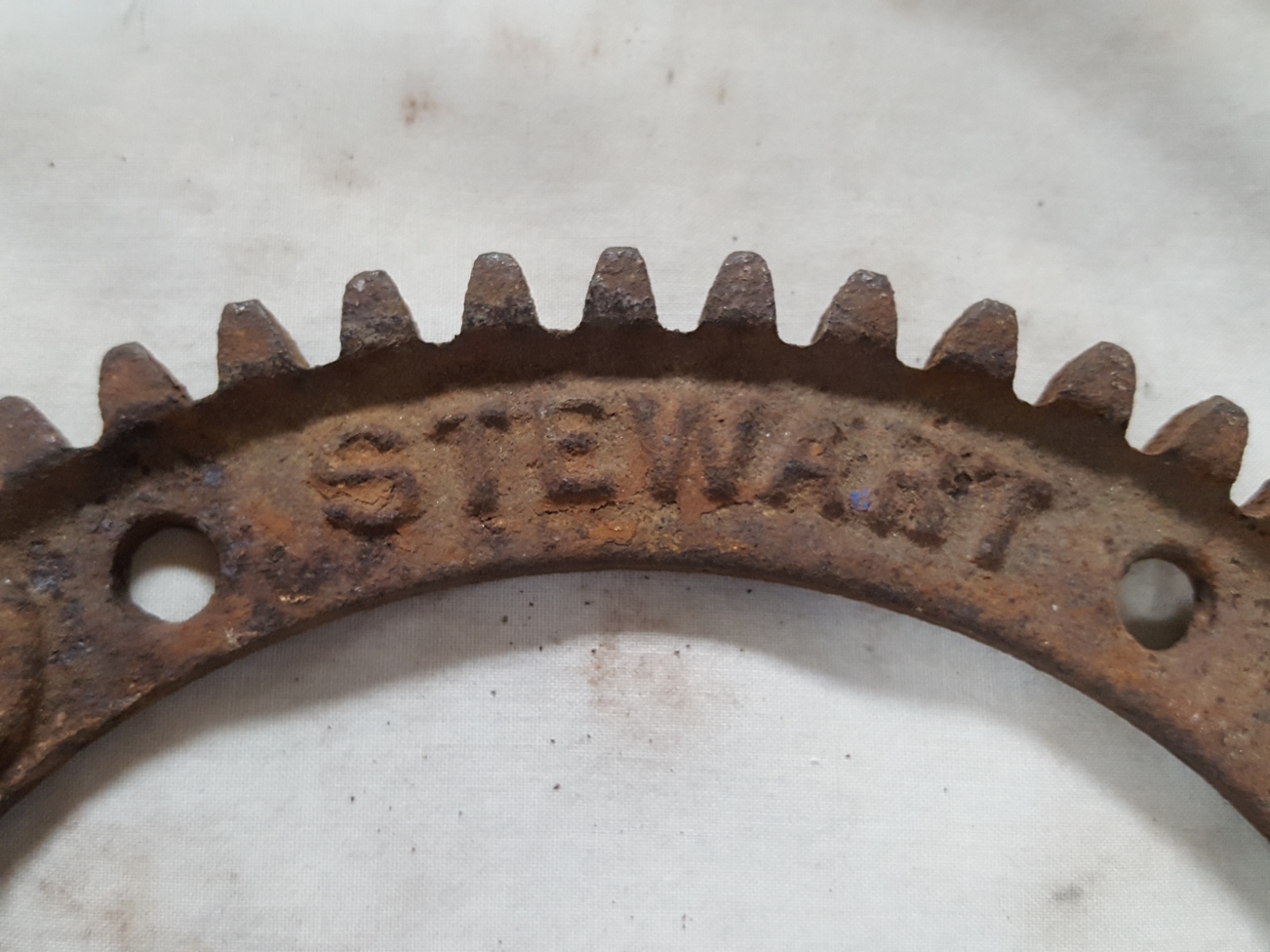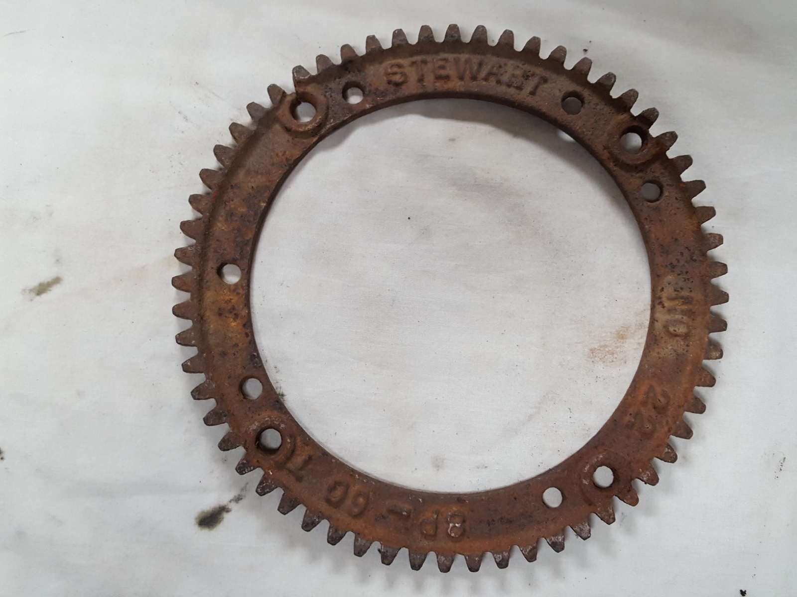 Cast gear with block letter Stewart used in 1911, proper 60 teeth and 8 pitch, good teeth, does need straightening ( does not lay flat on the table). $95, domestic postage $10.
