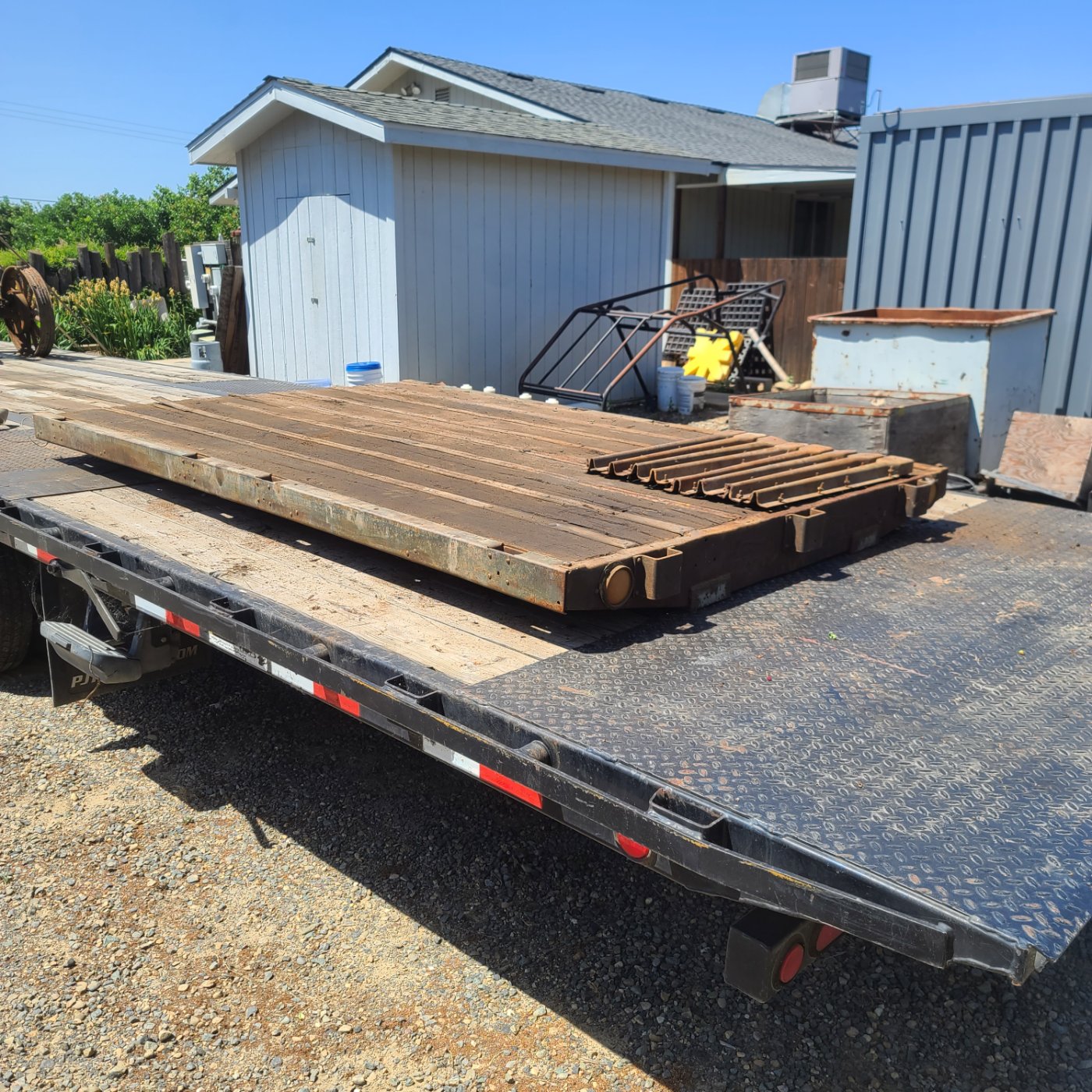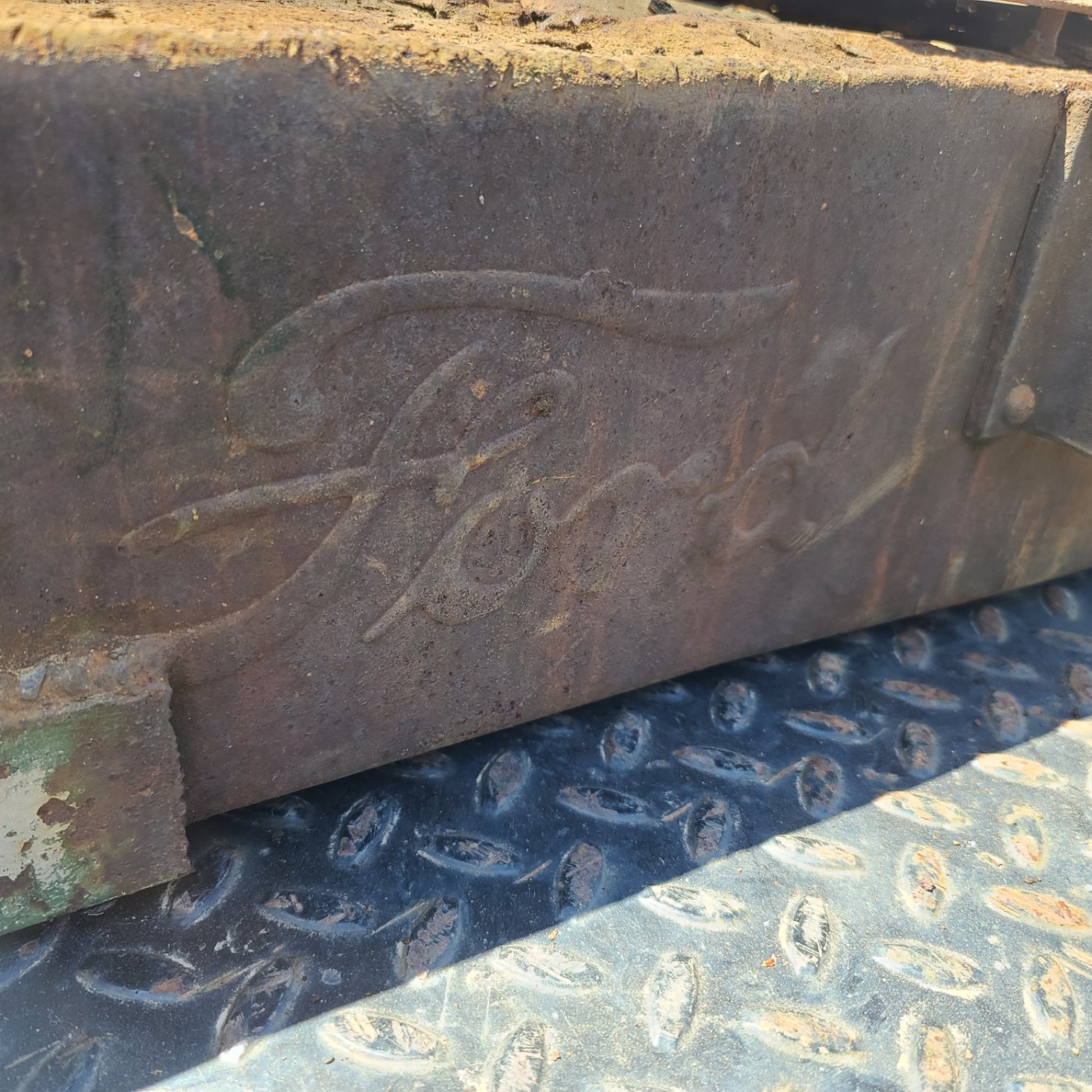 FS - Model T stake flat bed with stakes. This stake bed came on a 1923 Model TT truck and has duel "Ford" Script stamped into rear cross member.