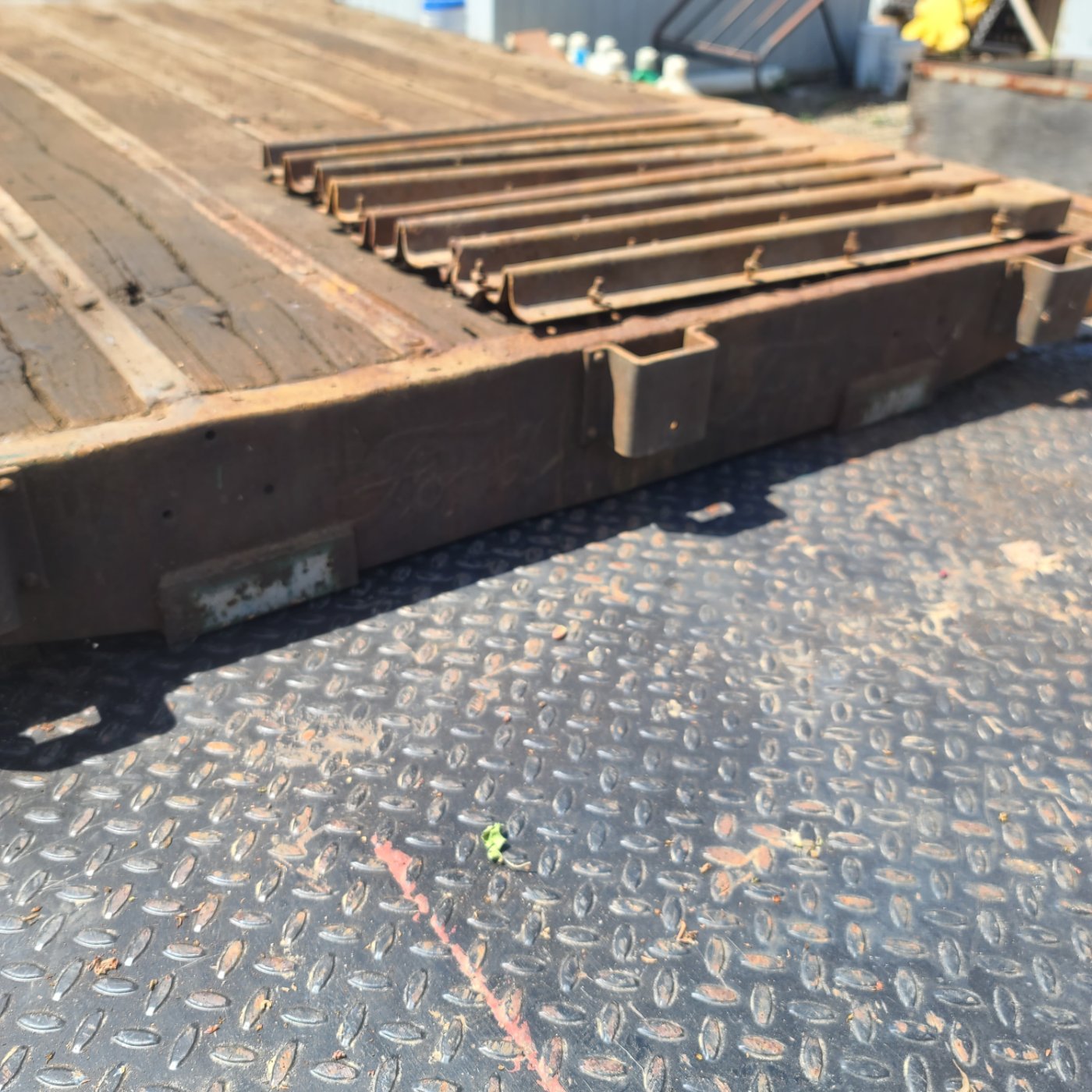 I assume it came off newer Ford truck. Measures 65 1/2" wide by 99 1/2" long and includes 8 bed stakes. Has some rust and several of the top bed moldings that hold the wood down should be replaced. $500